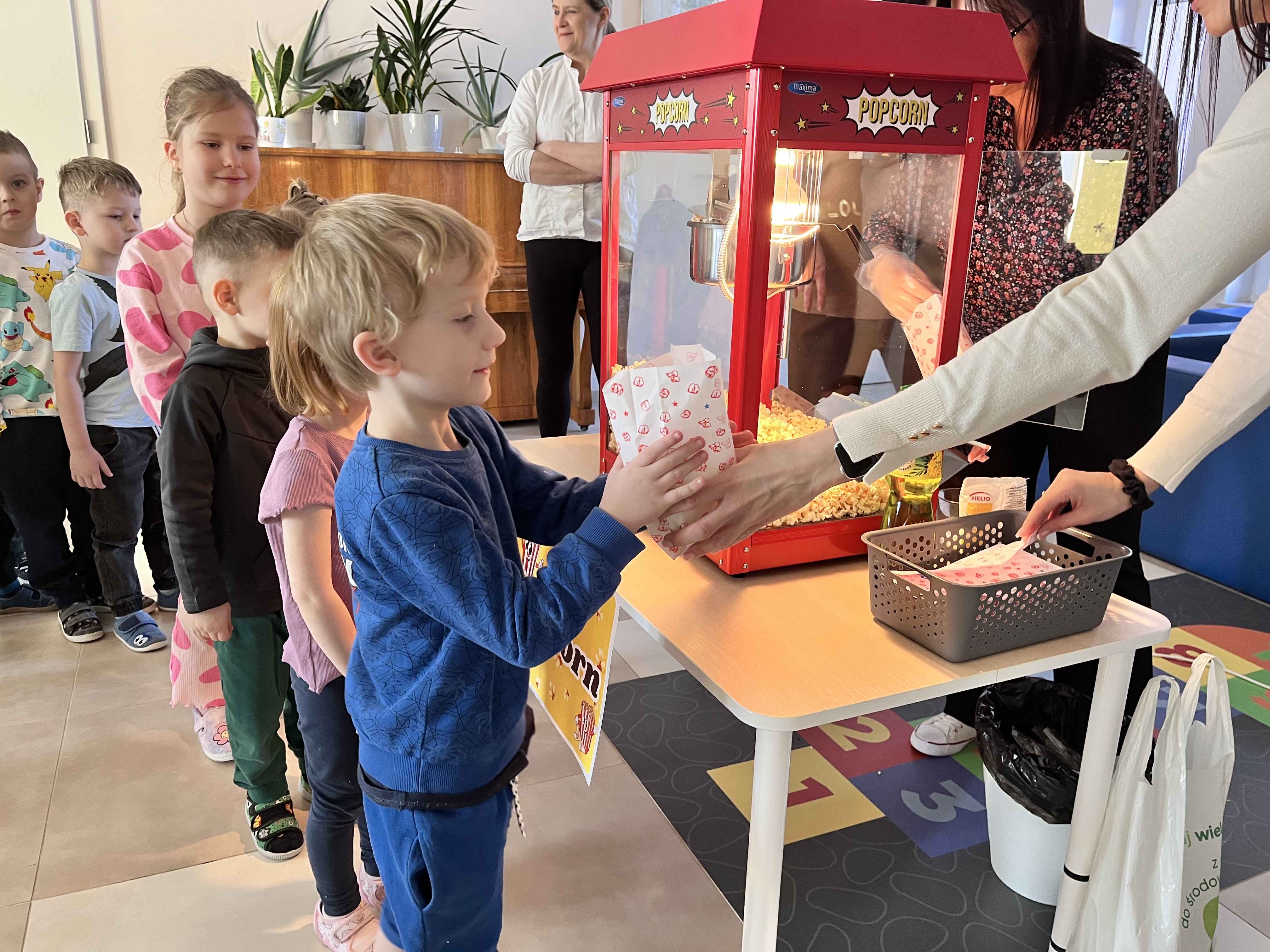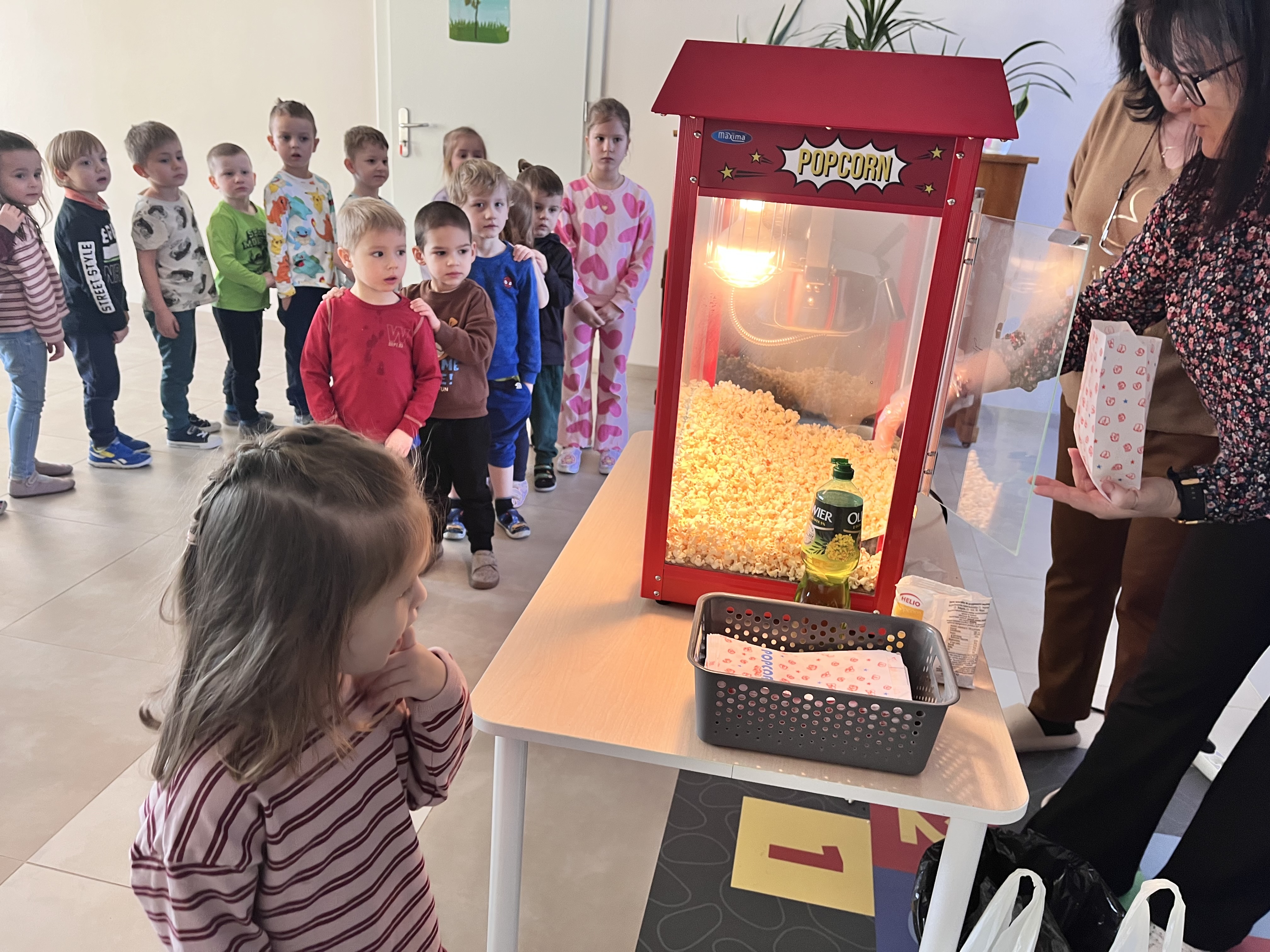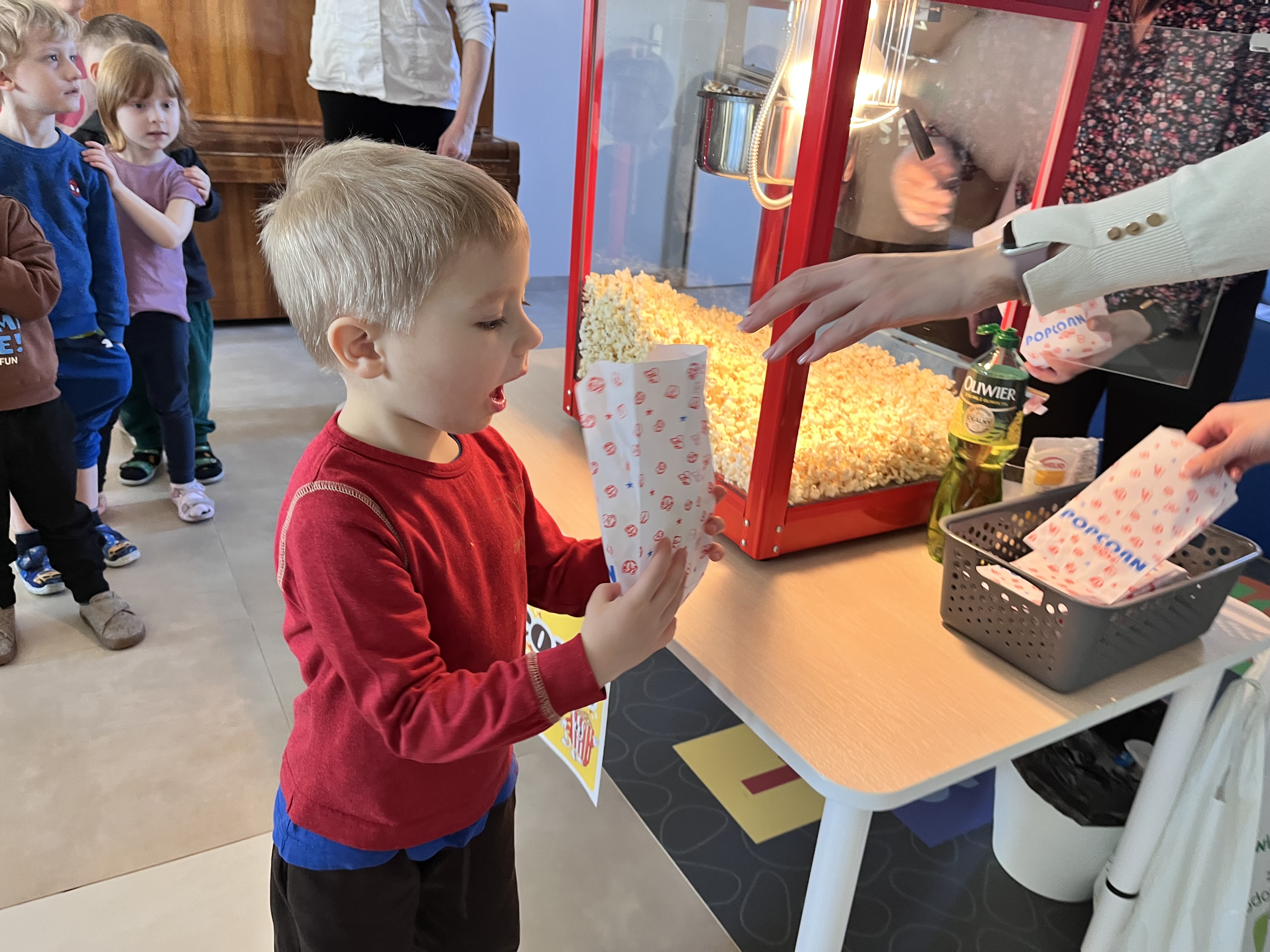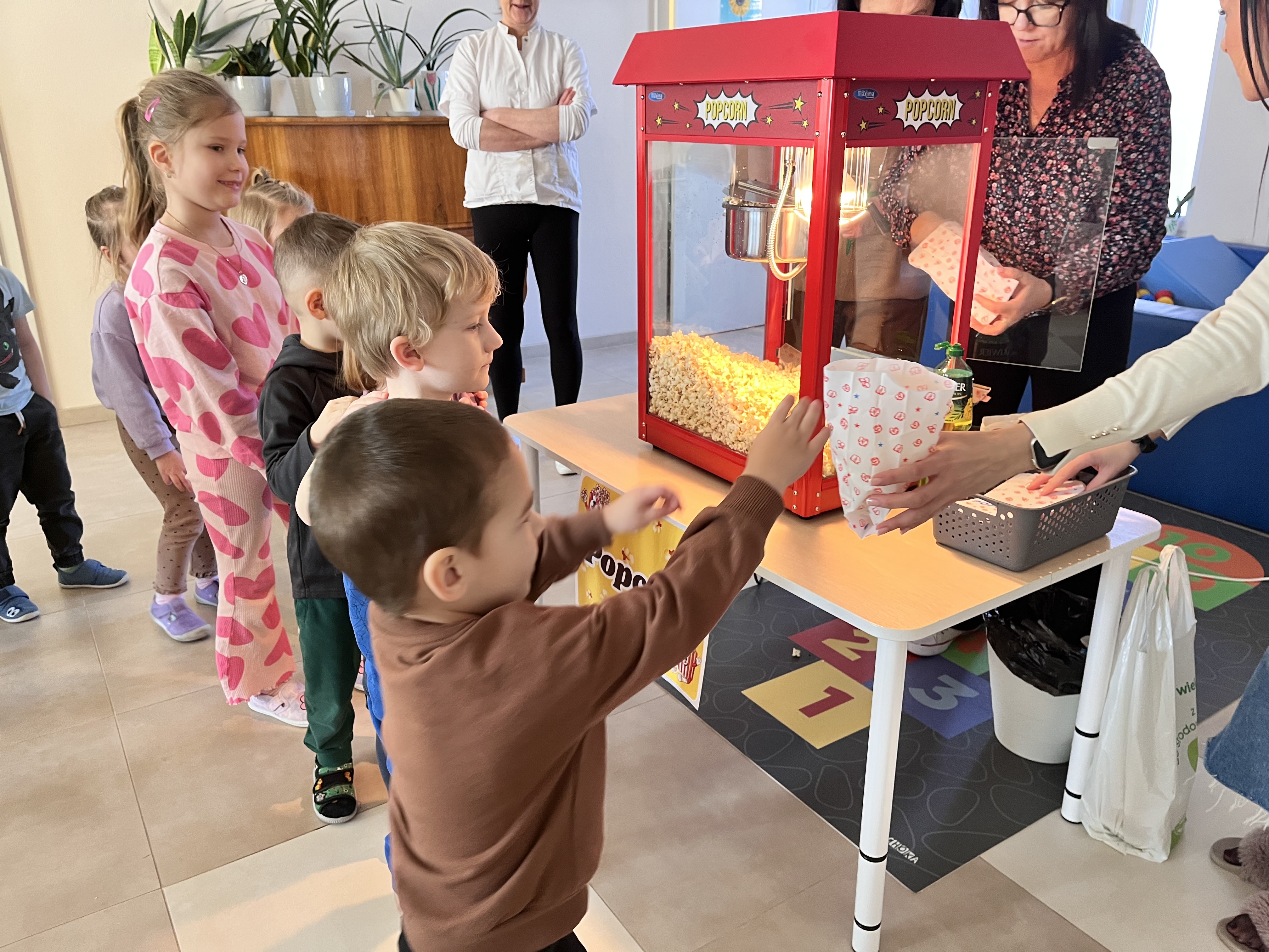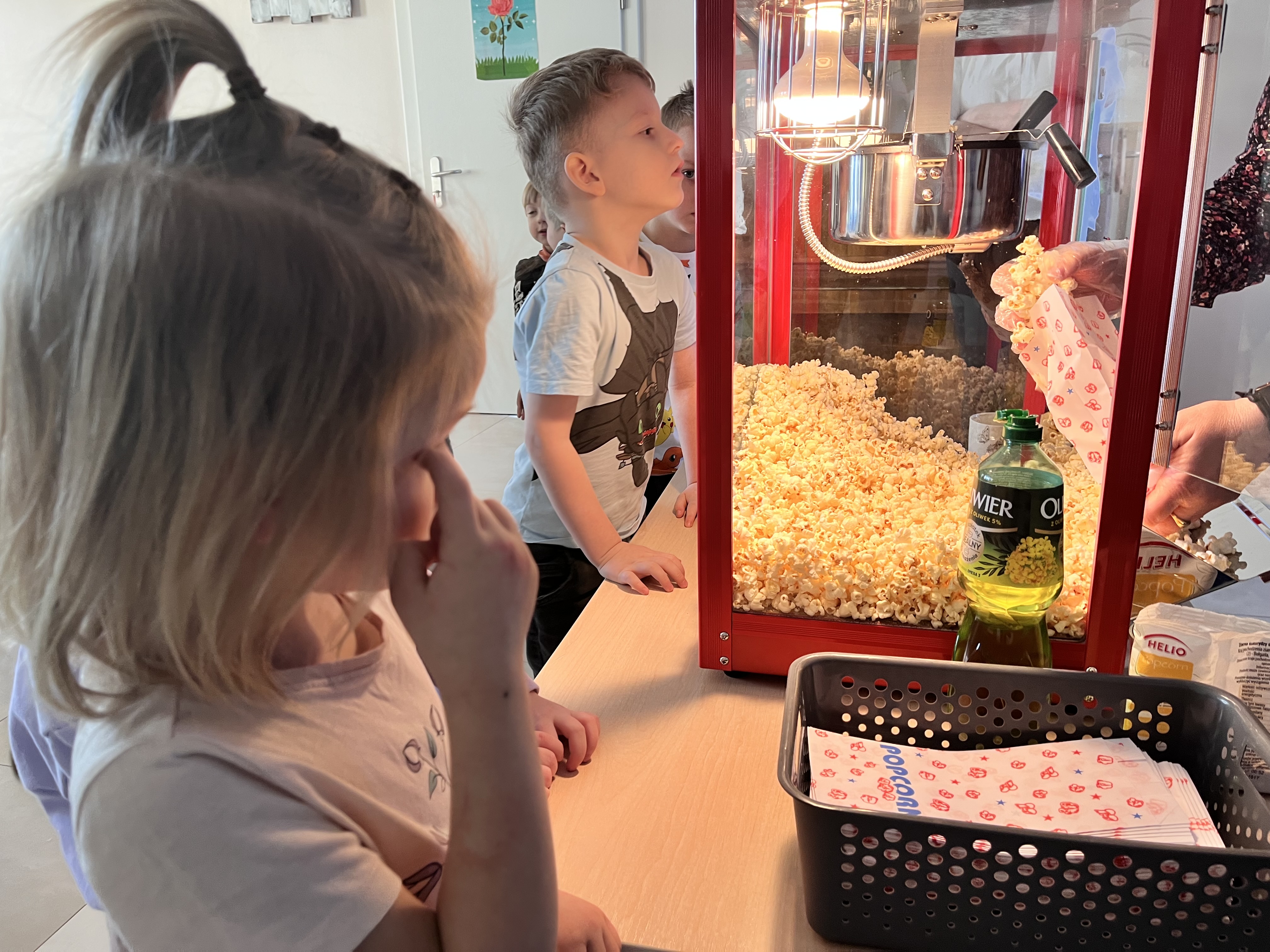 Ferie w naszej grupie upłynęły w radosnej i twórczej atmosferze. Był czas na relaks, zabawę i rozwijanie różnych umiejętności. Zorganizowaliśmy dzień filmowy, podczas którego dzieci mogły poczuć się jak w prawdziwym kinie – nie zabrakło oczywiście pysznego popcornu.