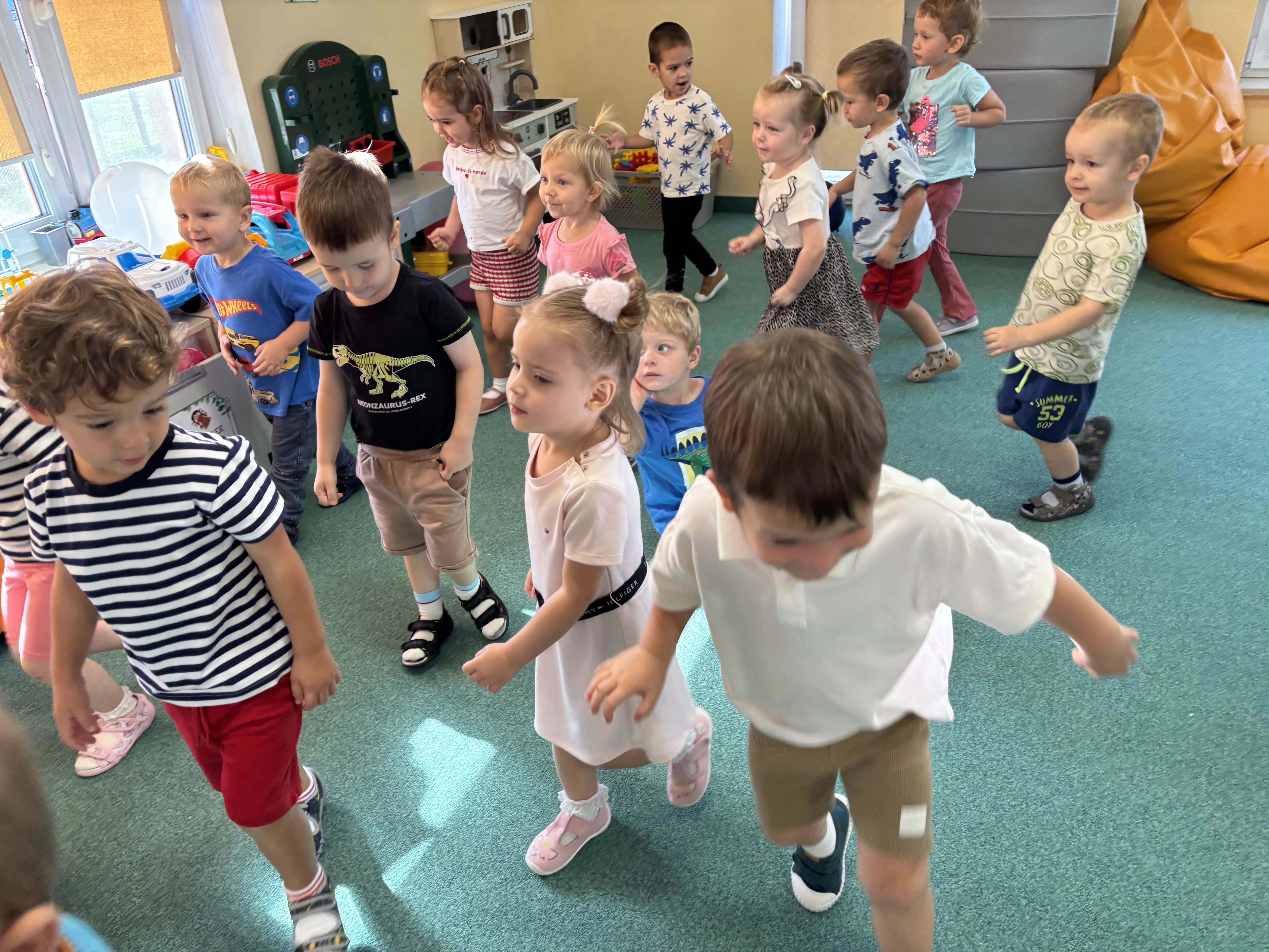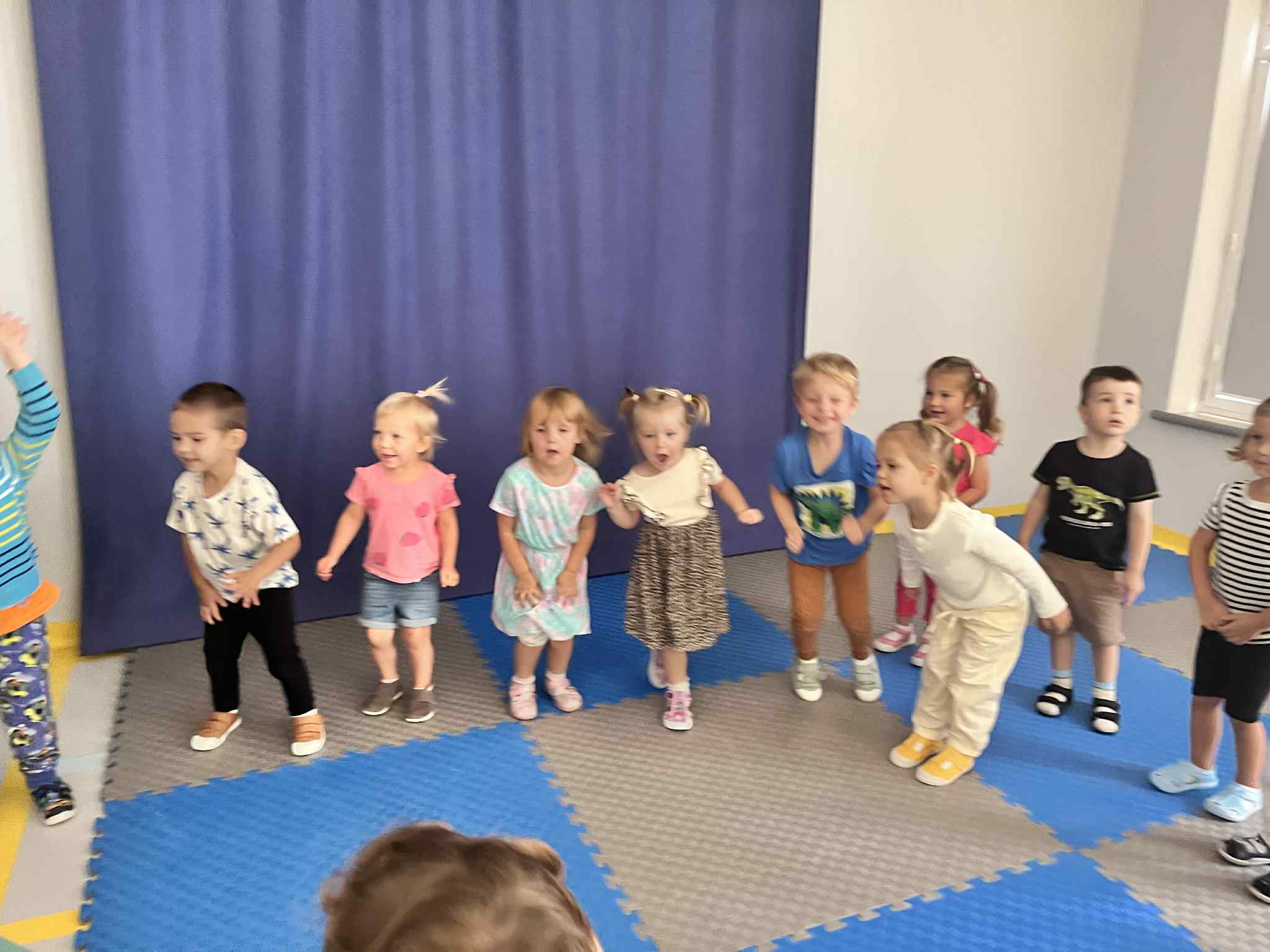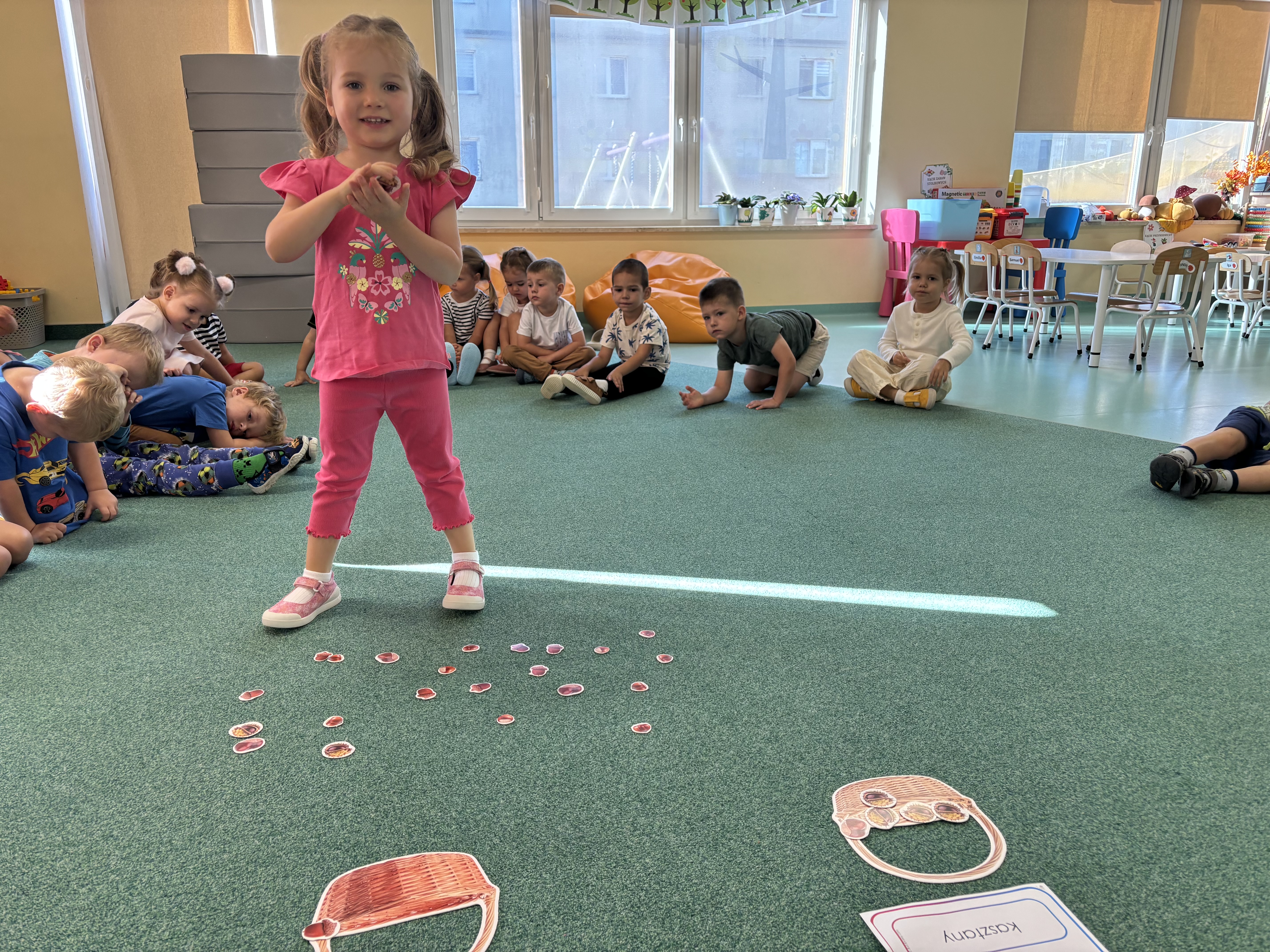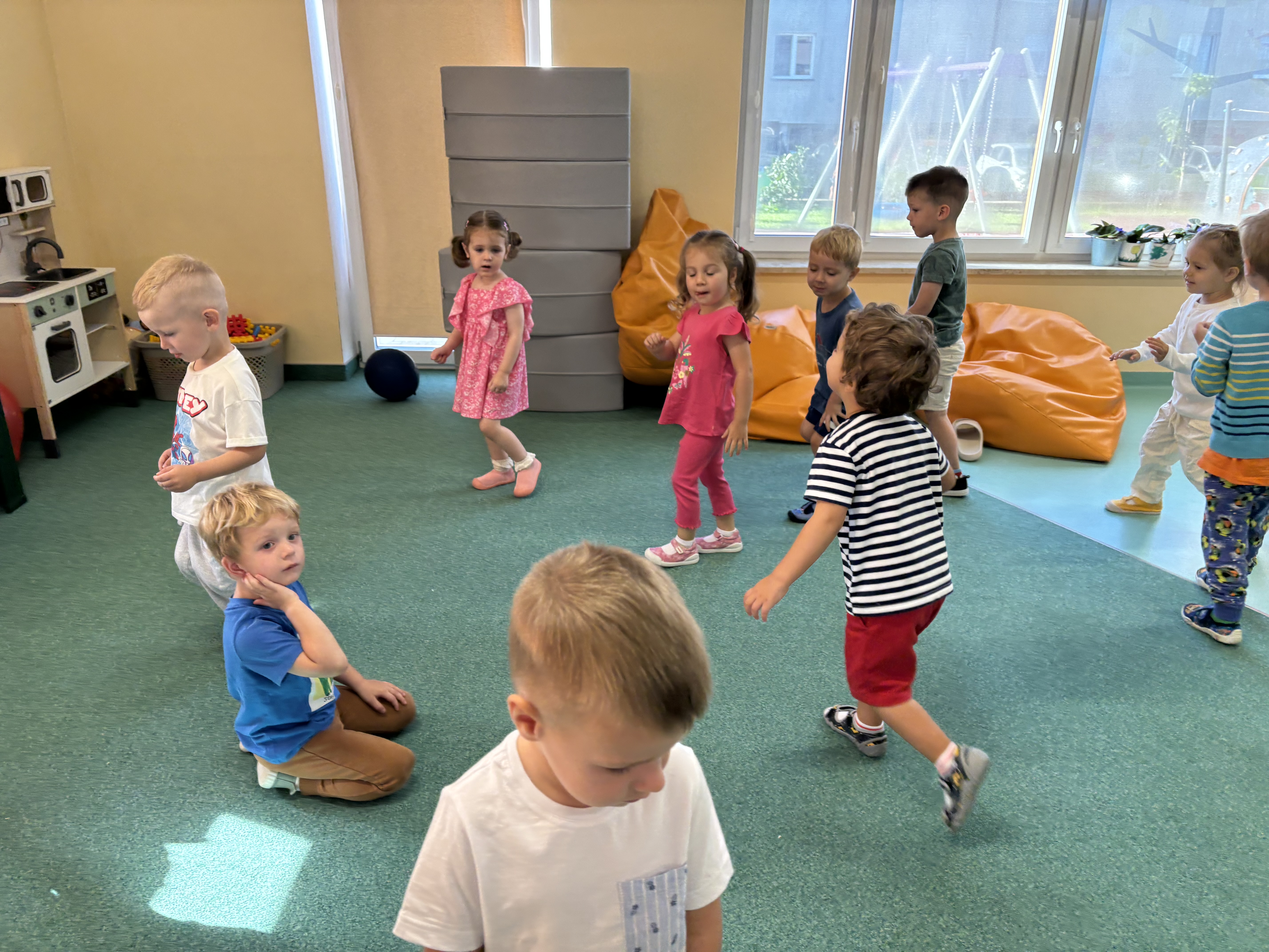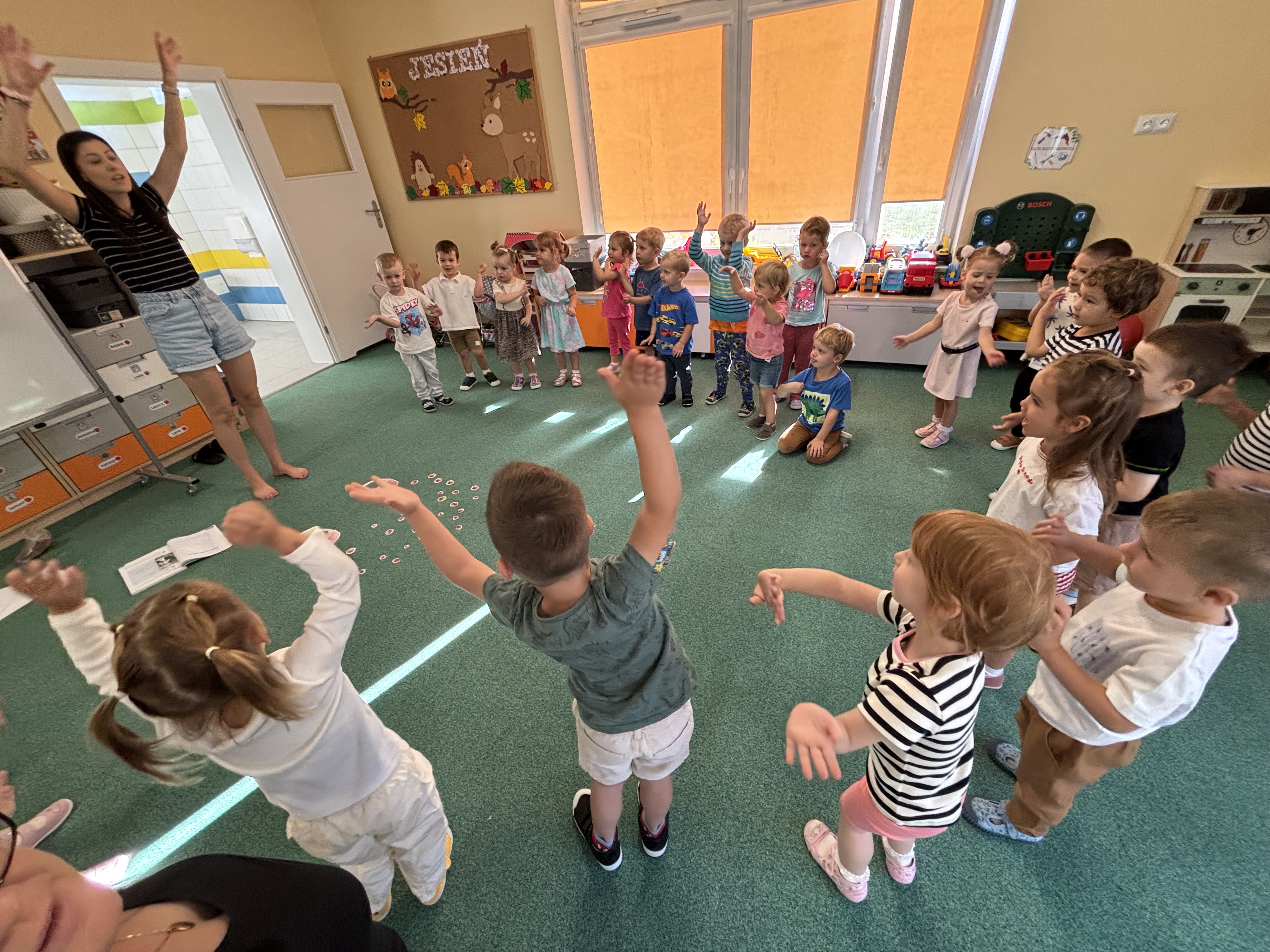 Na zajęciach rytmicznych dzieci uczyły się piosenek i zabaw ruchowych, rozwijały poczucie rytmu i koordynację ruchową. Podczas gimnastyki uczestniczyły w zabawach z elementami biegu, skoków oraz ćwiczeń równoważnych, wykorzystując przybory sportowe. Dzieci chętnie uczestniczyły w zajęciach, rozwijając swoją sprawność, kreatywność i wiedzę o otaczającym świecie. Wolny czas przedszkolaki spędzały nie tylko na zabawie swobodnej, ale również na świeżym powietrzu. Na spacerach dzieci poszukiwały oznak jesieni oraz uczyły się jak bezpiecznie zachować się na drodze.