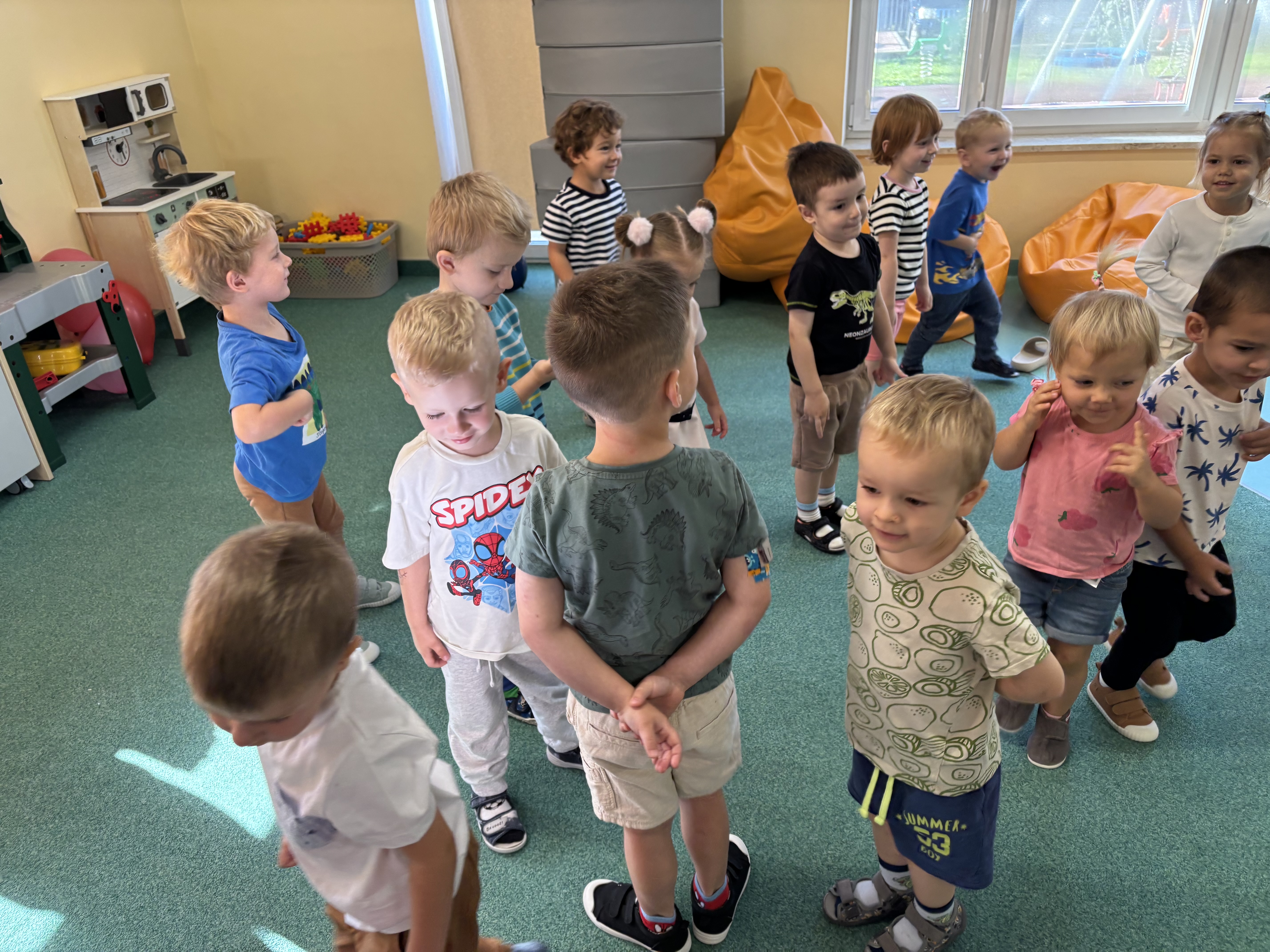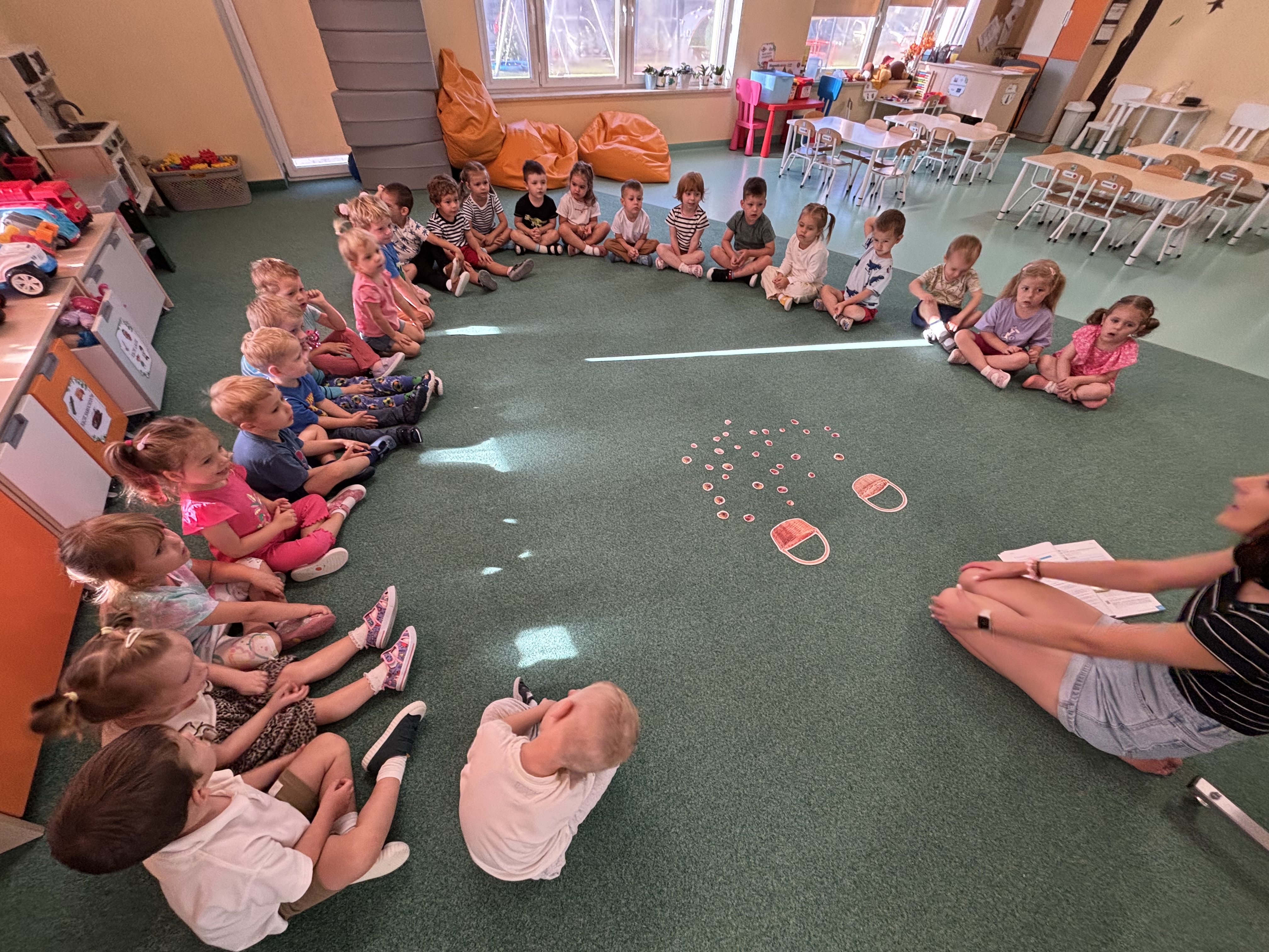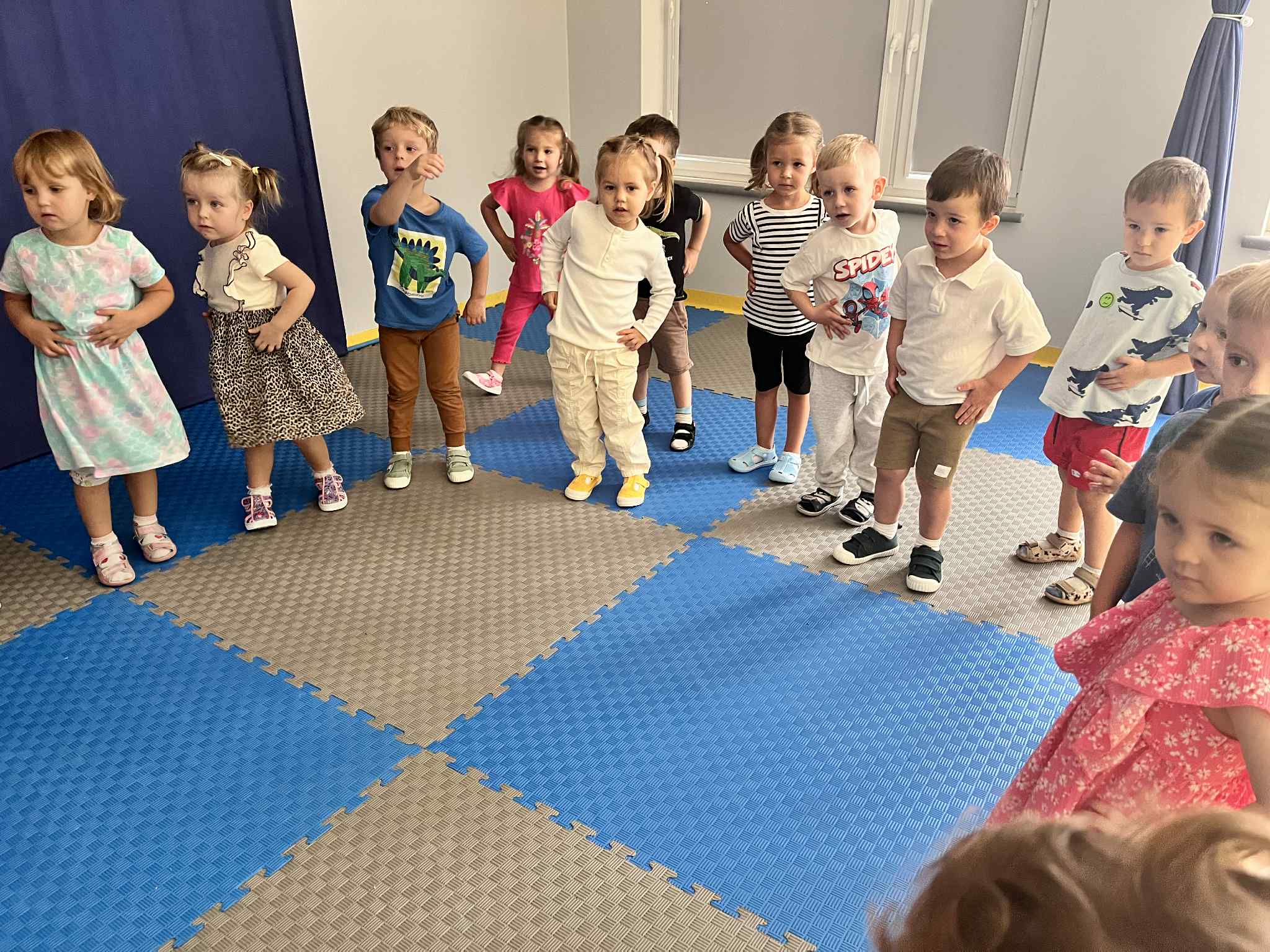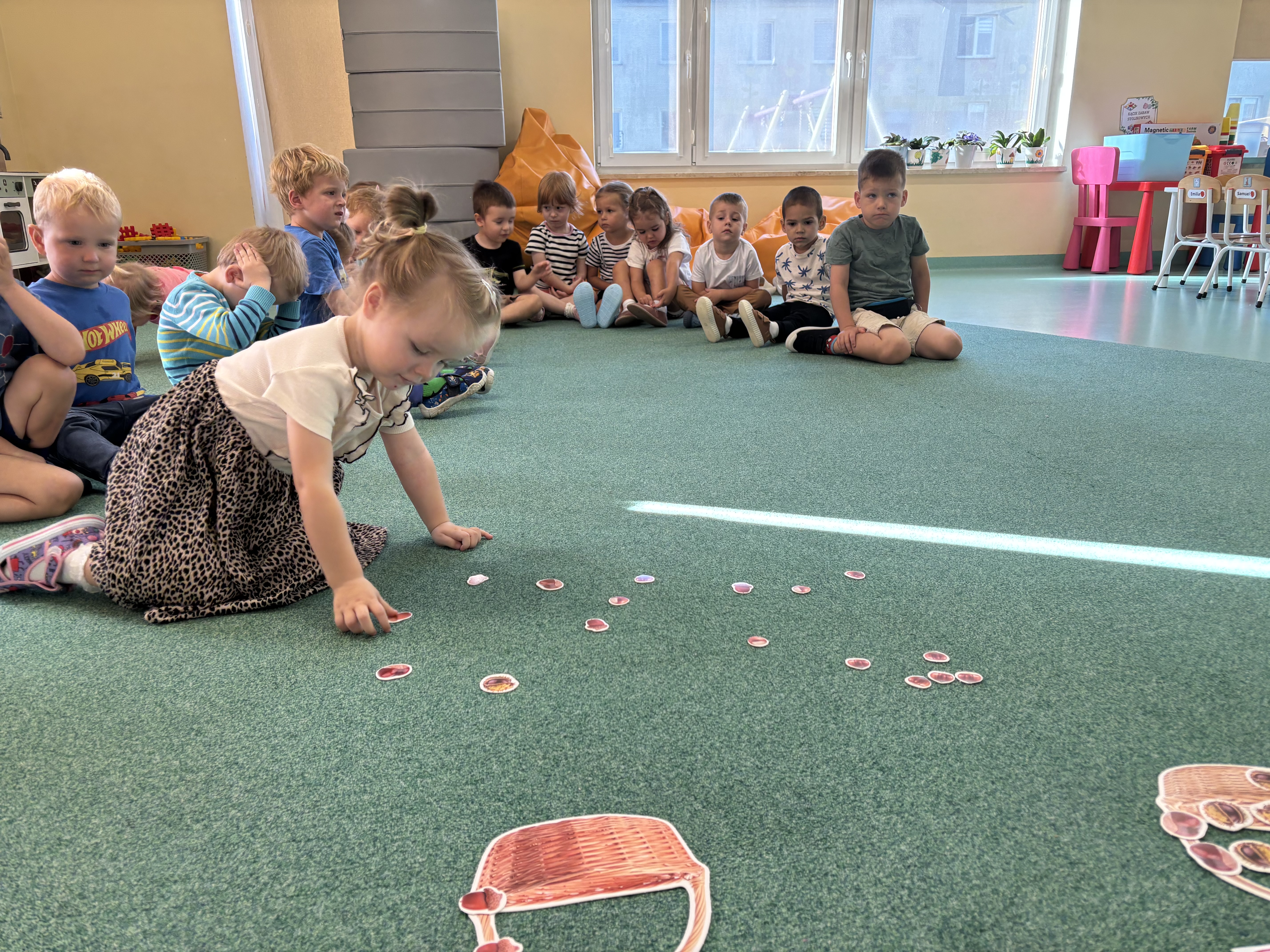 Na zajęciach rytmicznych dzieci uczyły się piosenek i zabaw ruchowych, rozwijały poczucie rytmu i koordynację ruchową. Podczas gimnastyki uczestniczyły w zabawach z elementami biegu, skoków oraz ćwiczeń równoważnych, wykorzystując przybory sportowe. Dzieci chętnie uczestniczyły w zajęciach, rozwijając swoją sprawność, kreatywność i wiedzę o otaczającym świecie. Wolny czas przedszkolaki spędzały nie tylko na zabawie swobodnej, ale również na świeżym powietrzu. Na spacerach dzieci poszukiwały oznak jesieni oraz uczyły się jak bezpiecznie zachować się na drodze.