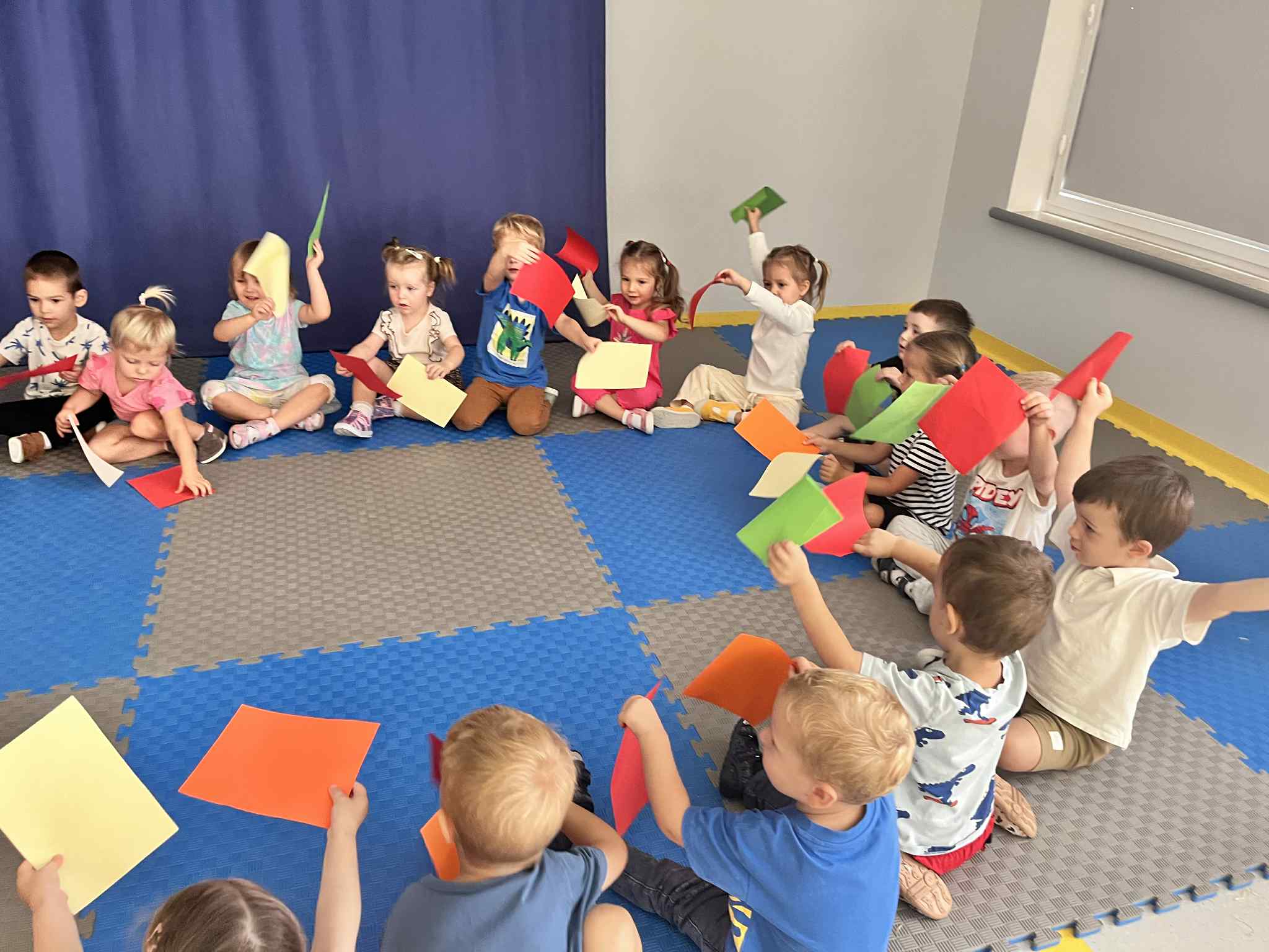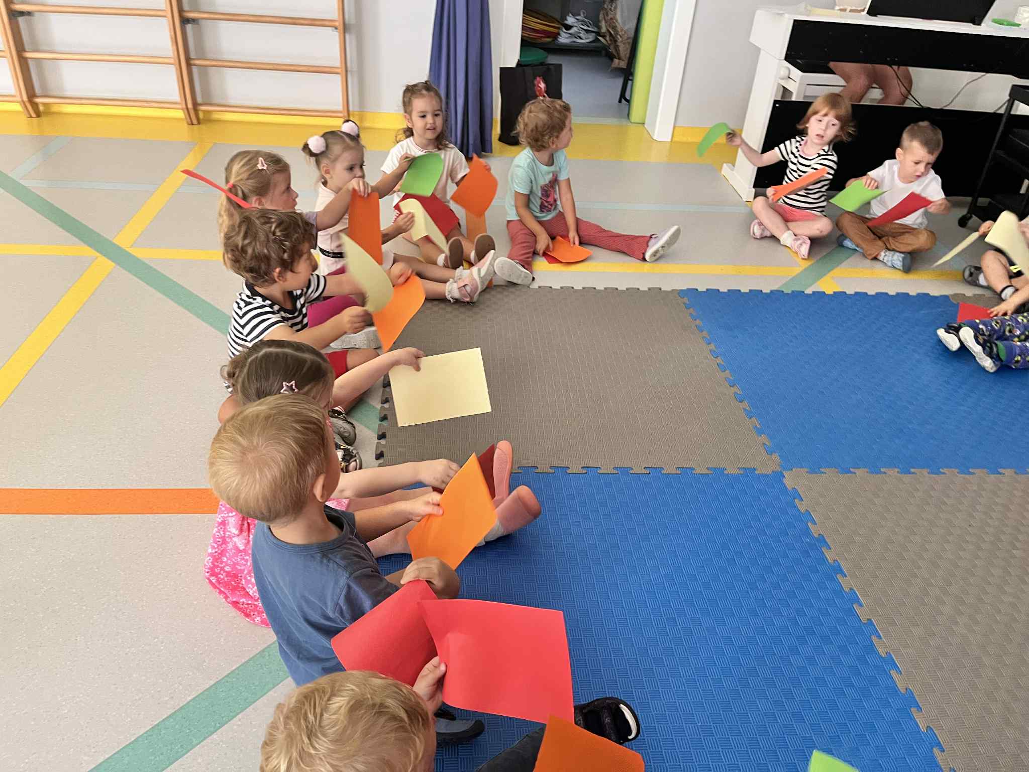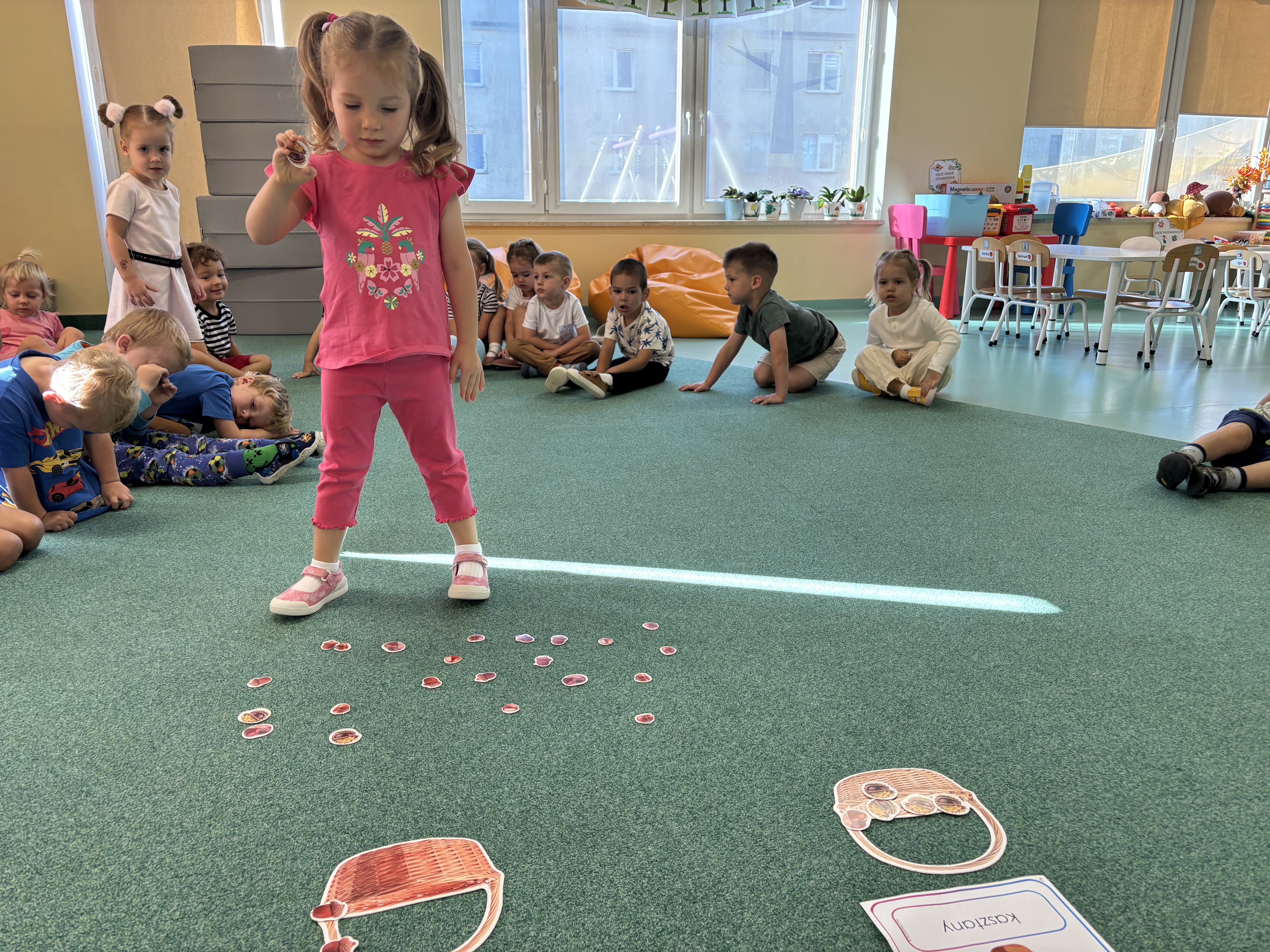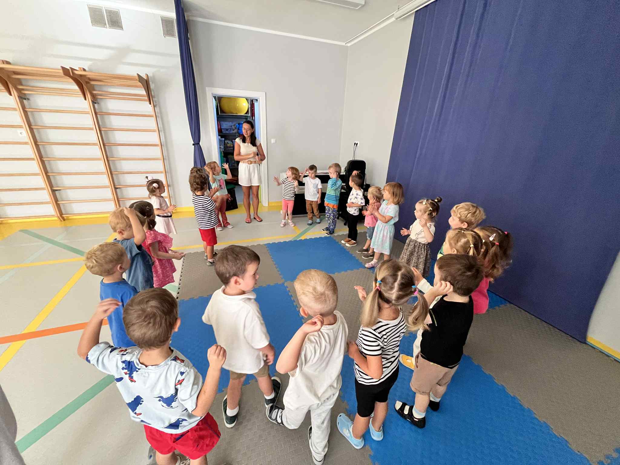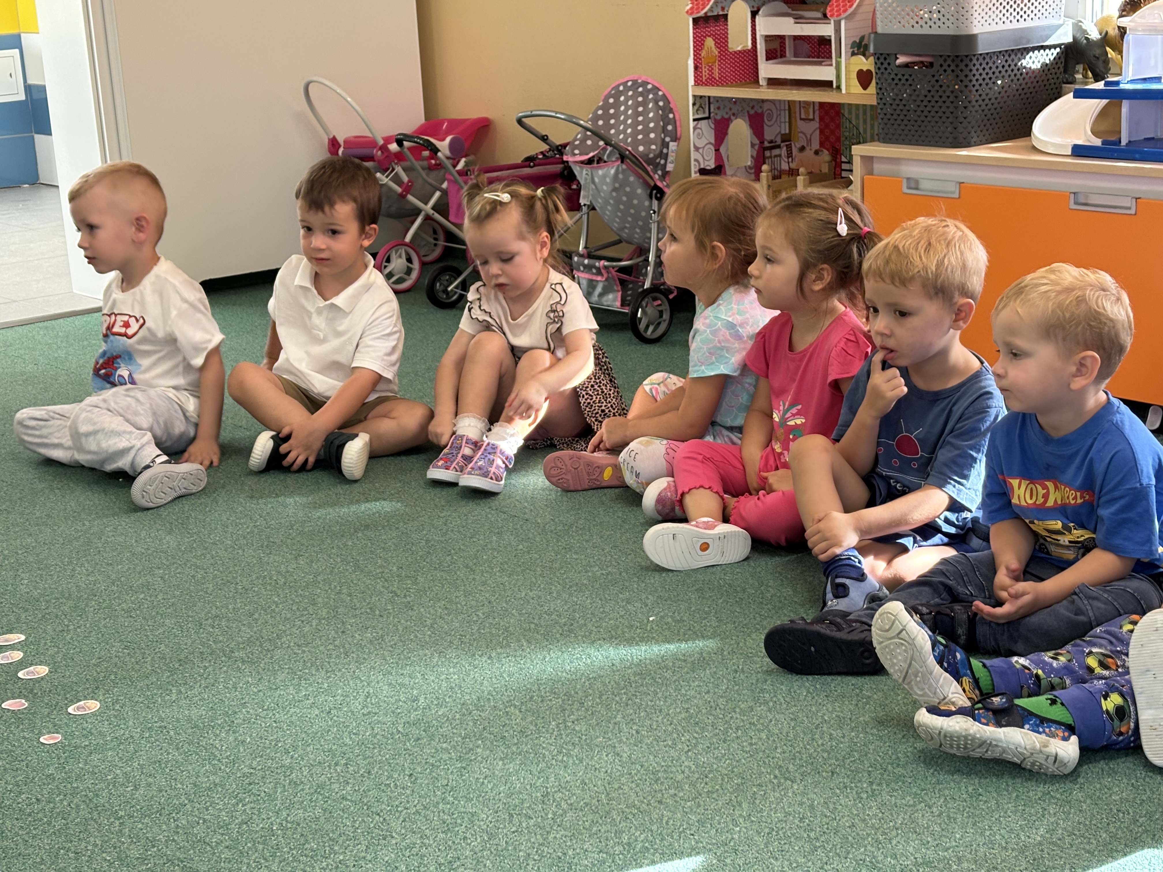 Na zajęciach rytmicznych dzieci uczyły się piosenek i zabaw ruchowych, rozwijały poczucie rytmu i koordynację ruchową. Podczas gimnastyki uczestniczyły w zabawach z elementami biegu, skoków oraz ćwiczeń równoważnych, wykorzystując przybory sportowe. Dzieci chętnie uczestniczyły w zajęciach, rozwijając swoją sprawność, kreatywność i wiedzę o otaczającym świecie. Wolny czas przedszkolaki spędzały nie tylko na zabawie swobodnej, ale również na świeżym powietrzu. Na spacerach dzieci poszukiwały oznak jesieni oraz uczyły się jak bezpiecznie zachować się na drodze.