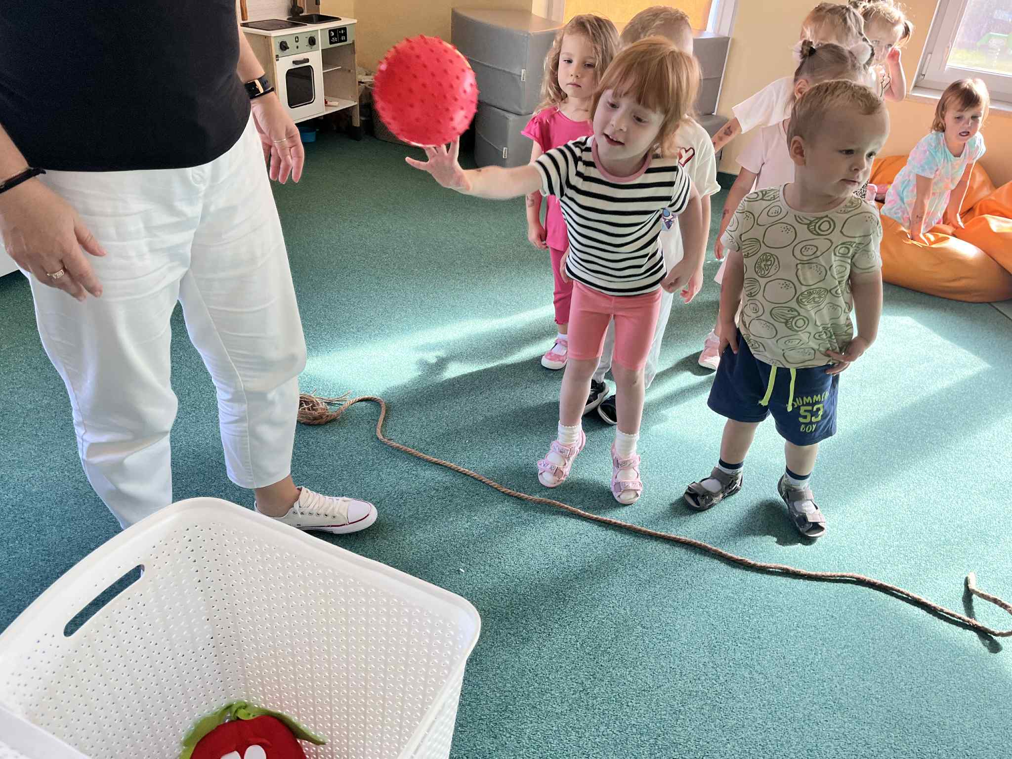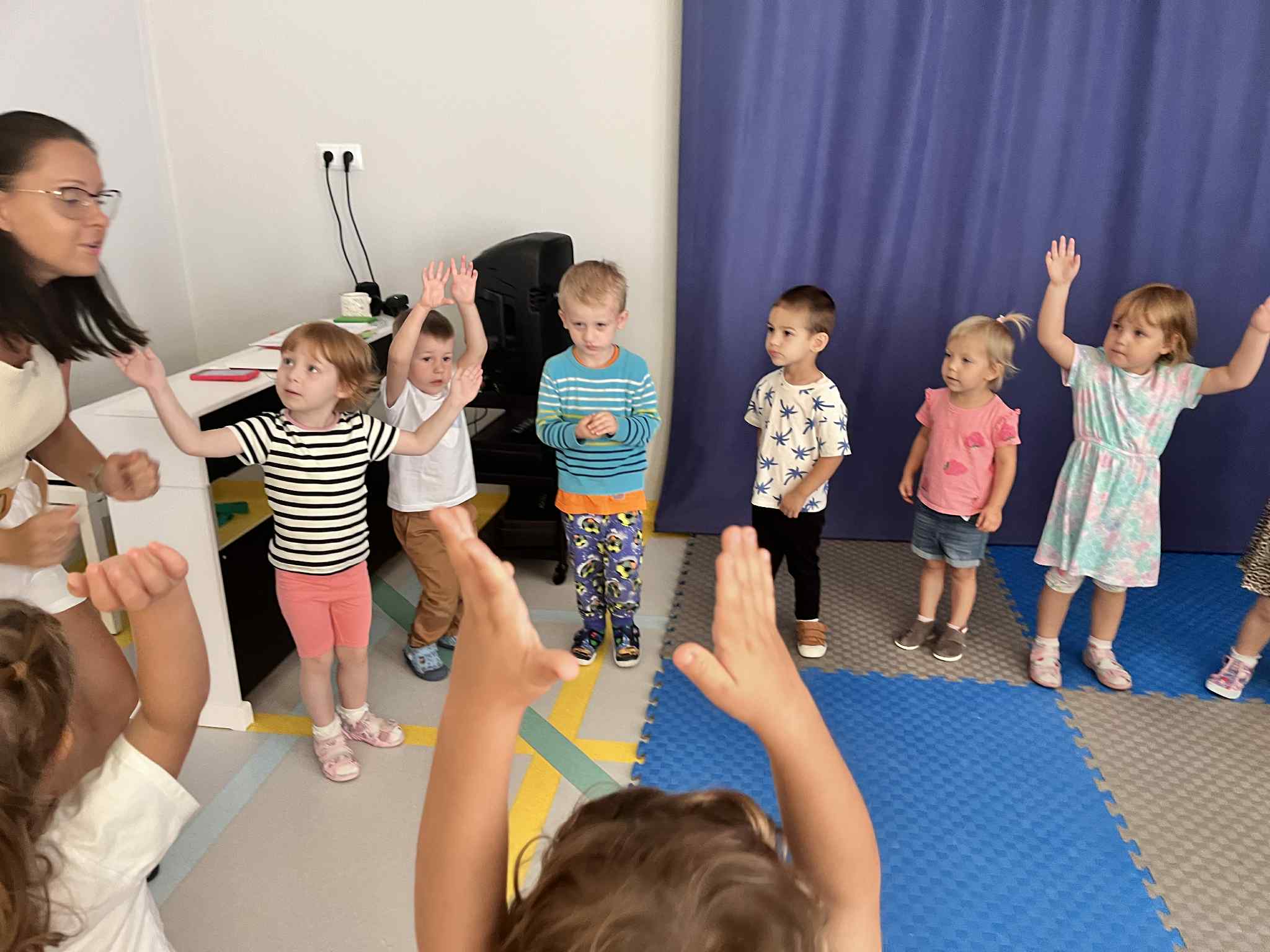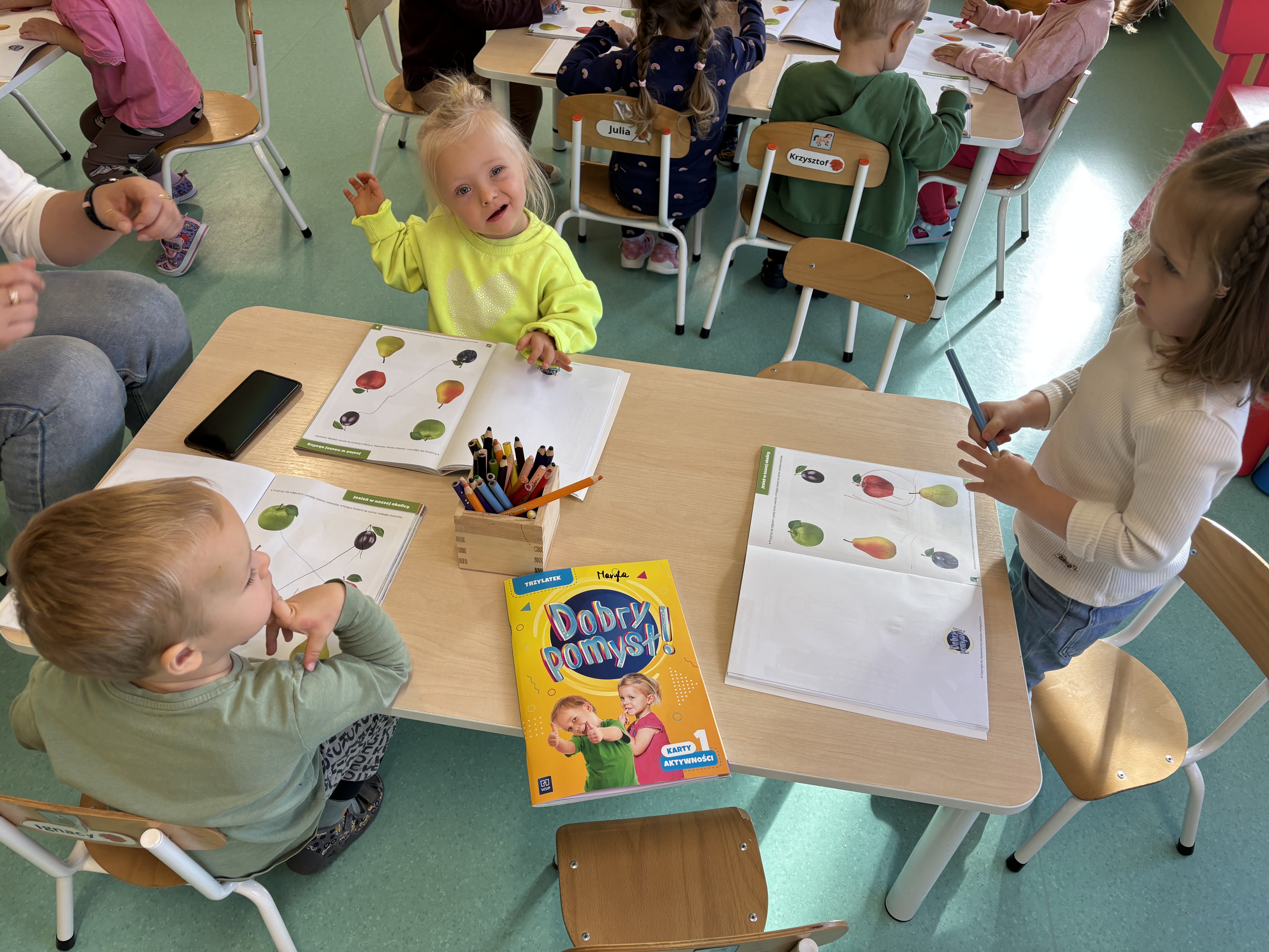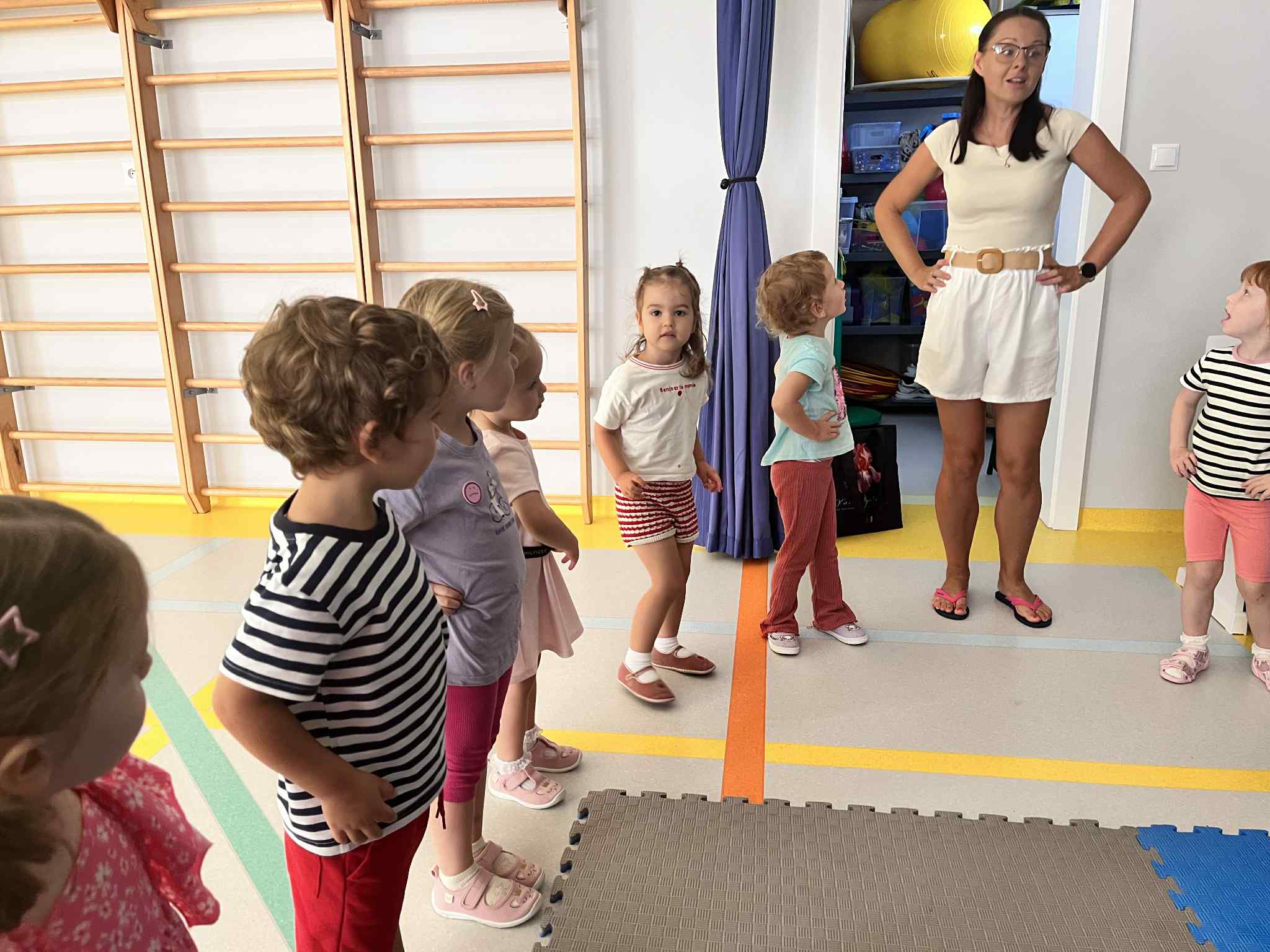Na zajęciach rytmicznych dzieci uczyły się piosenek i zabaw ruchowych, rozwijały poczucie rytmu i koordynację ruchową. Podczas gimnastyki uczestniczyły w zabawach z elementami biegu, skoków oraz ćwiczeń równoważnych, wykorzystując przybory sportowe. Dzieci chętnie uczestniczyły w zajęciach, rozwijając swoją sprawność, kreatywność i wiedzę o otaczającym świecie. Wolny czas przedszkolaki spędzały nie tylko na zabawie swobodnej, ale również na świeżym powietrzu. Na spacerach dzieci poszukiwały oznak jesieni oraz uczyły się jak bezpiecznie zachować się na drodze.