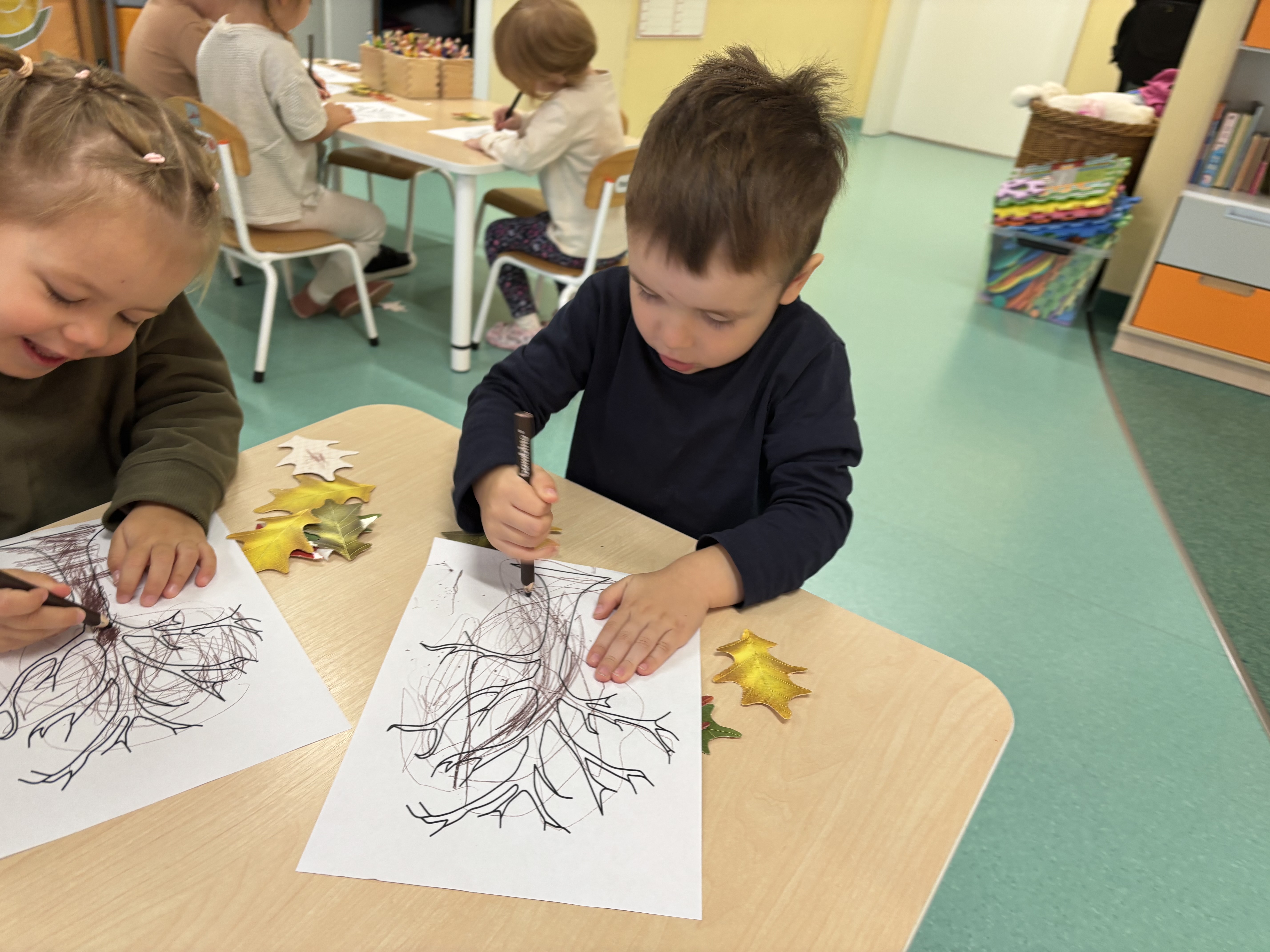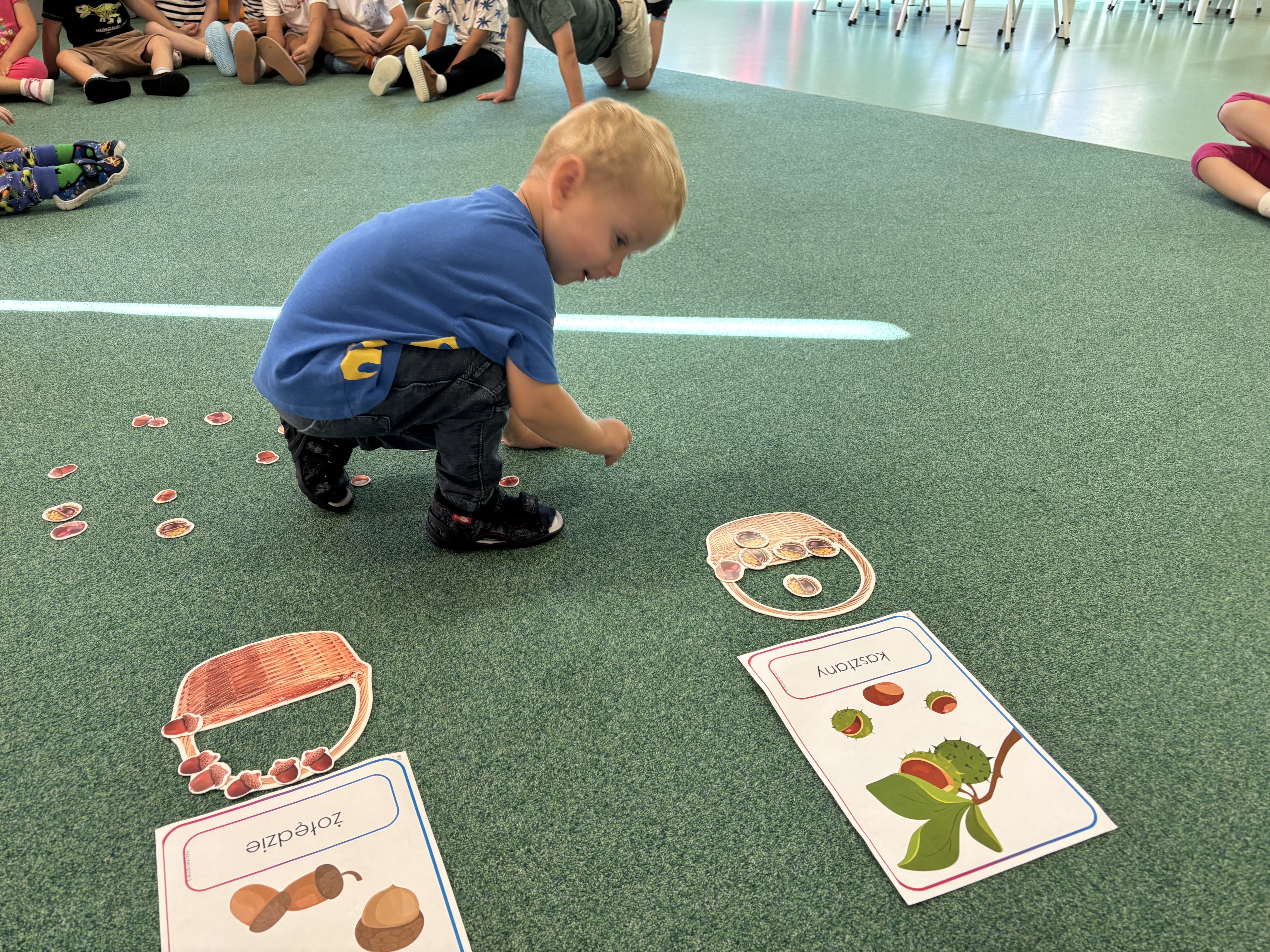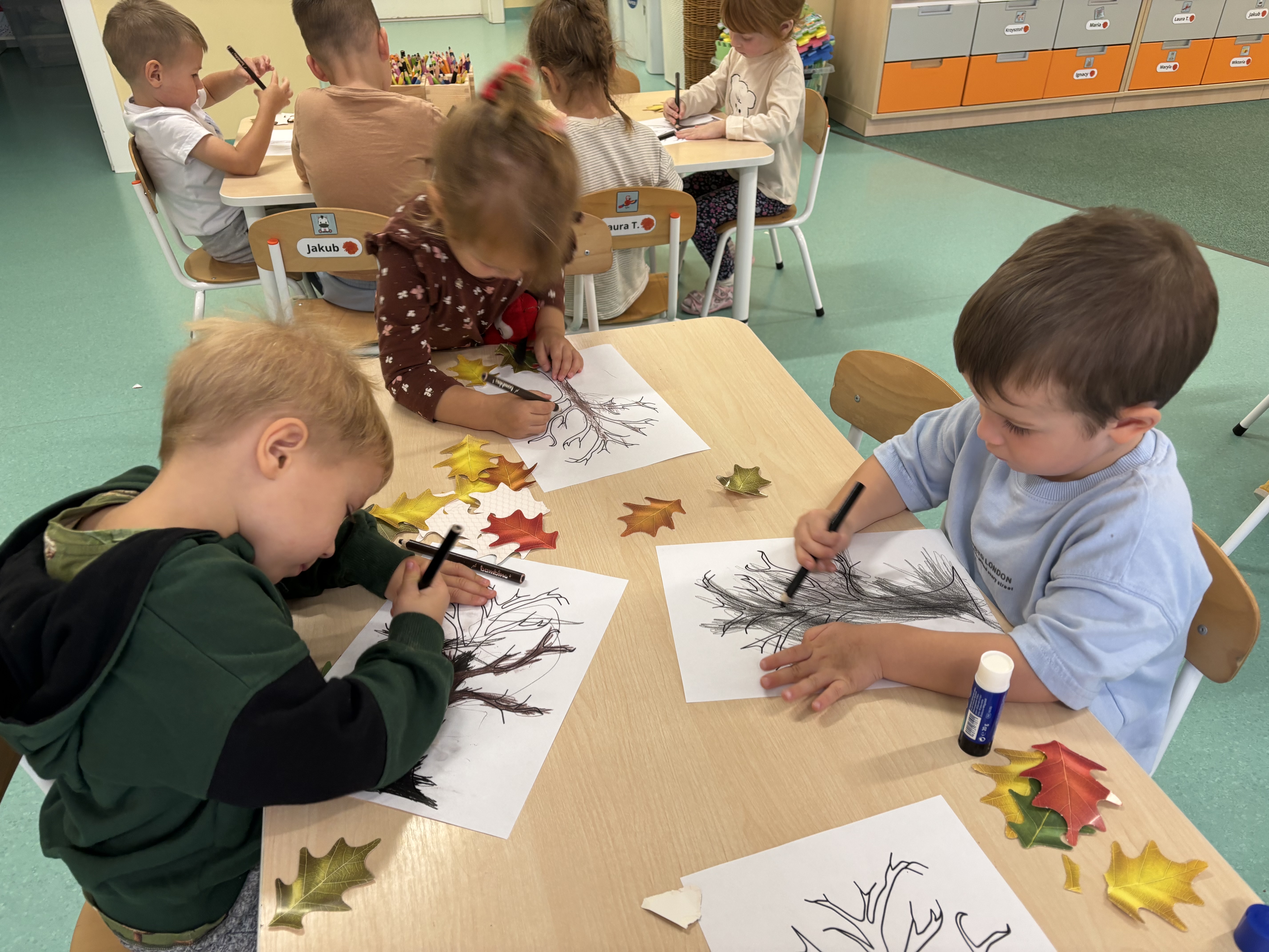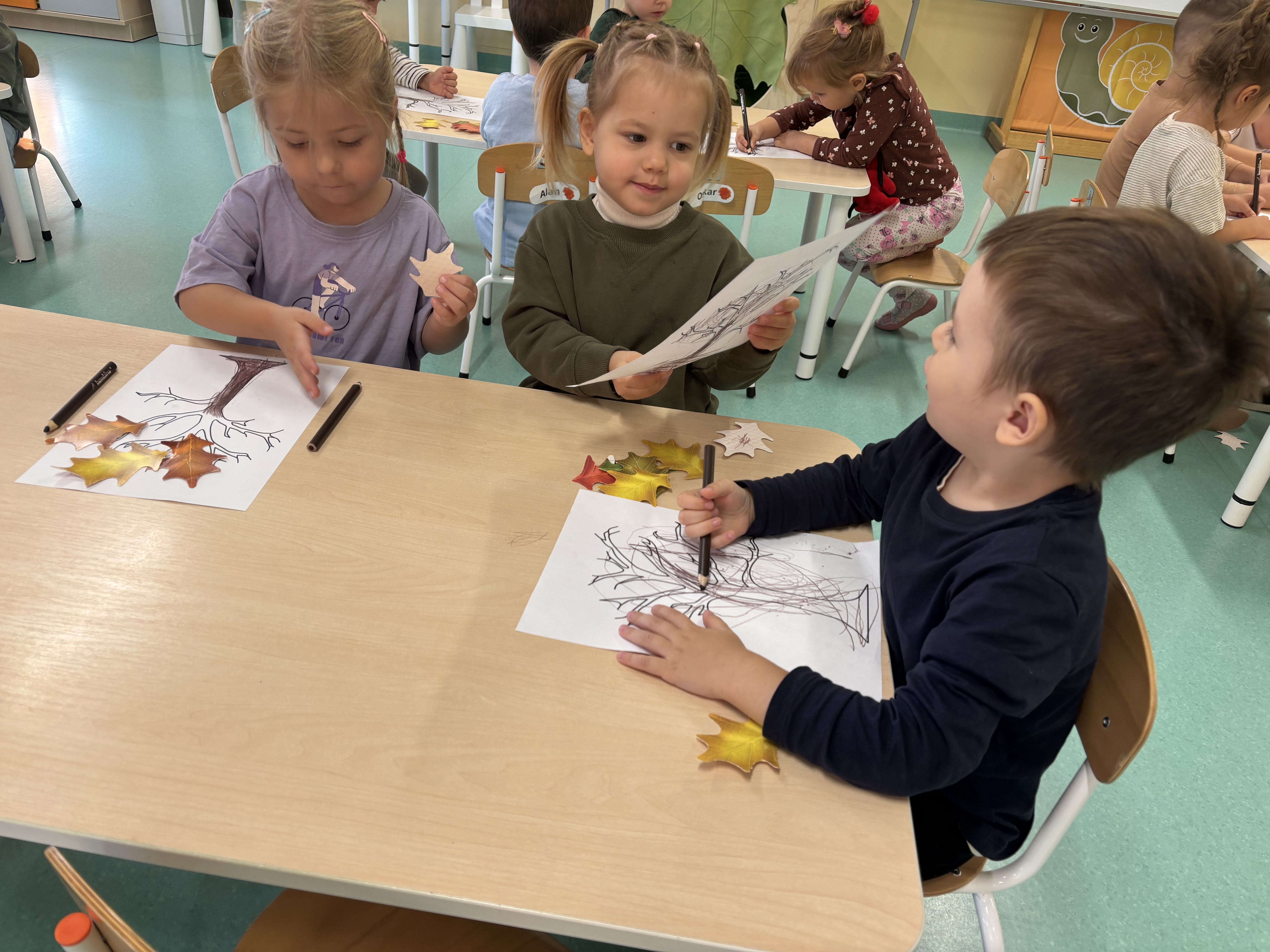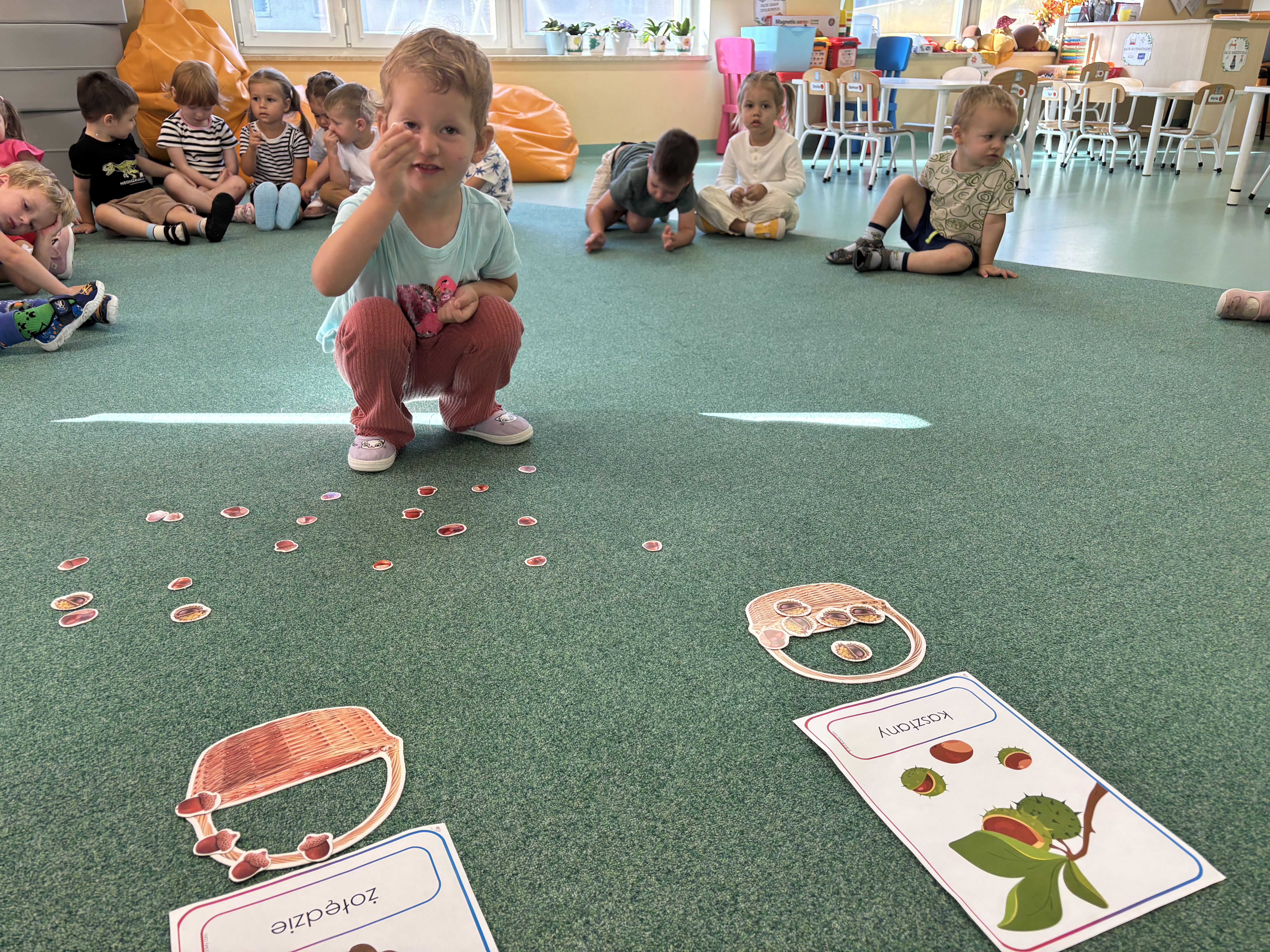 W minionym tygodniu dzieci poznawały uroki jesieni. Podczas zajęć plastycznych tworzyły prace z wykorzystaniem darów jesieni – liści, kasztanów i żołędzi. Rozmawiały o zmianach w przyrodzie, oglądały jesienne owoce i warzywa, a także słuchały opowiadań i wierszy o jesieni.
