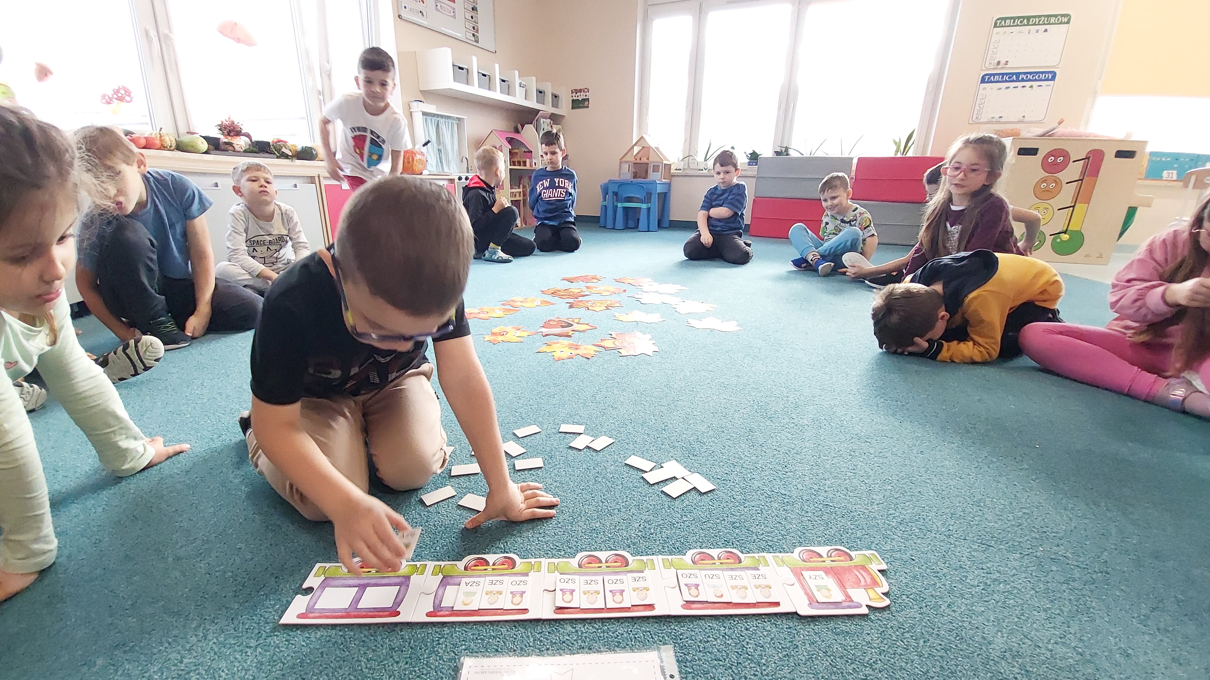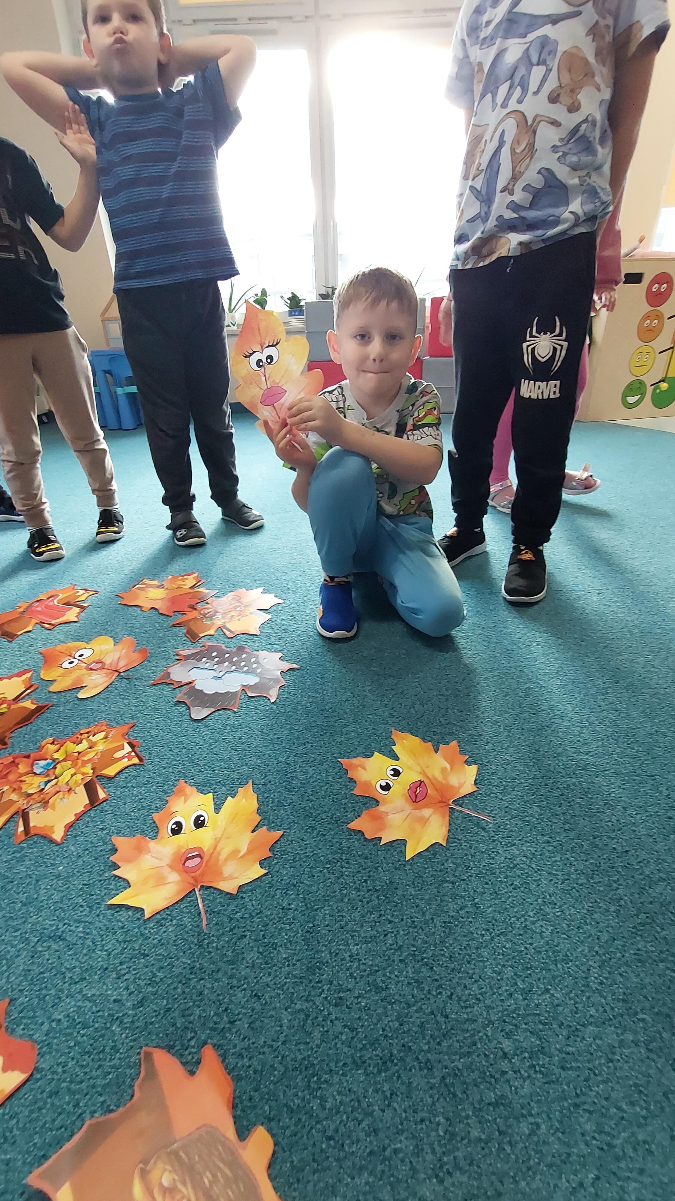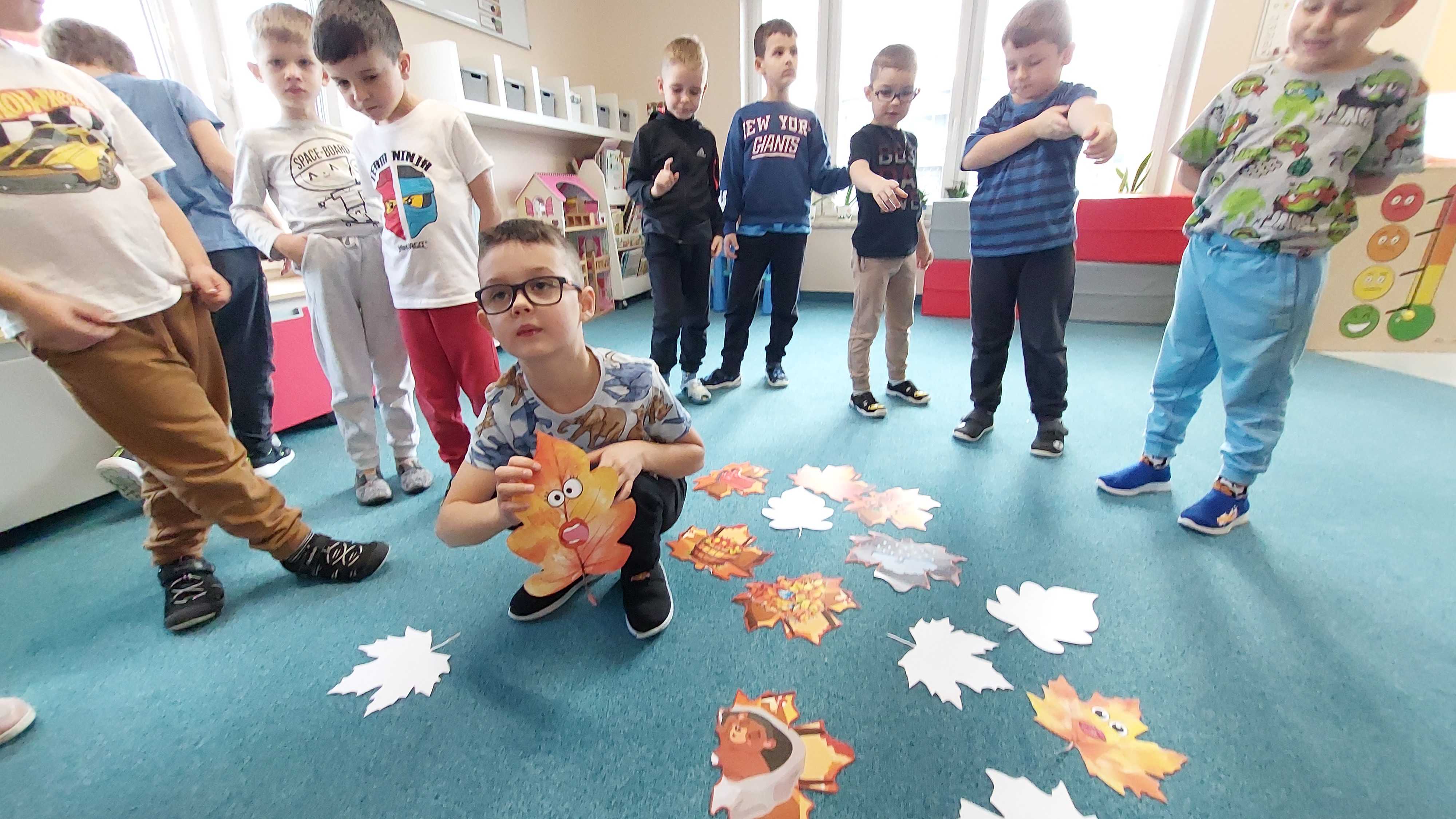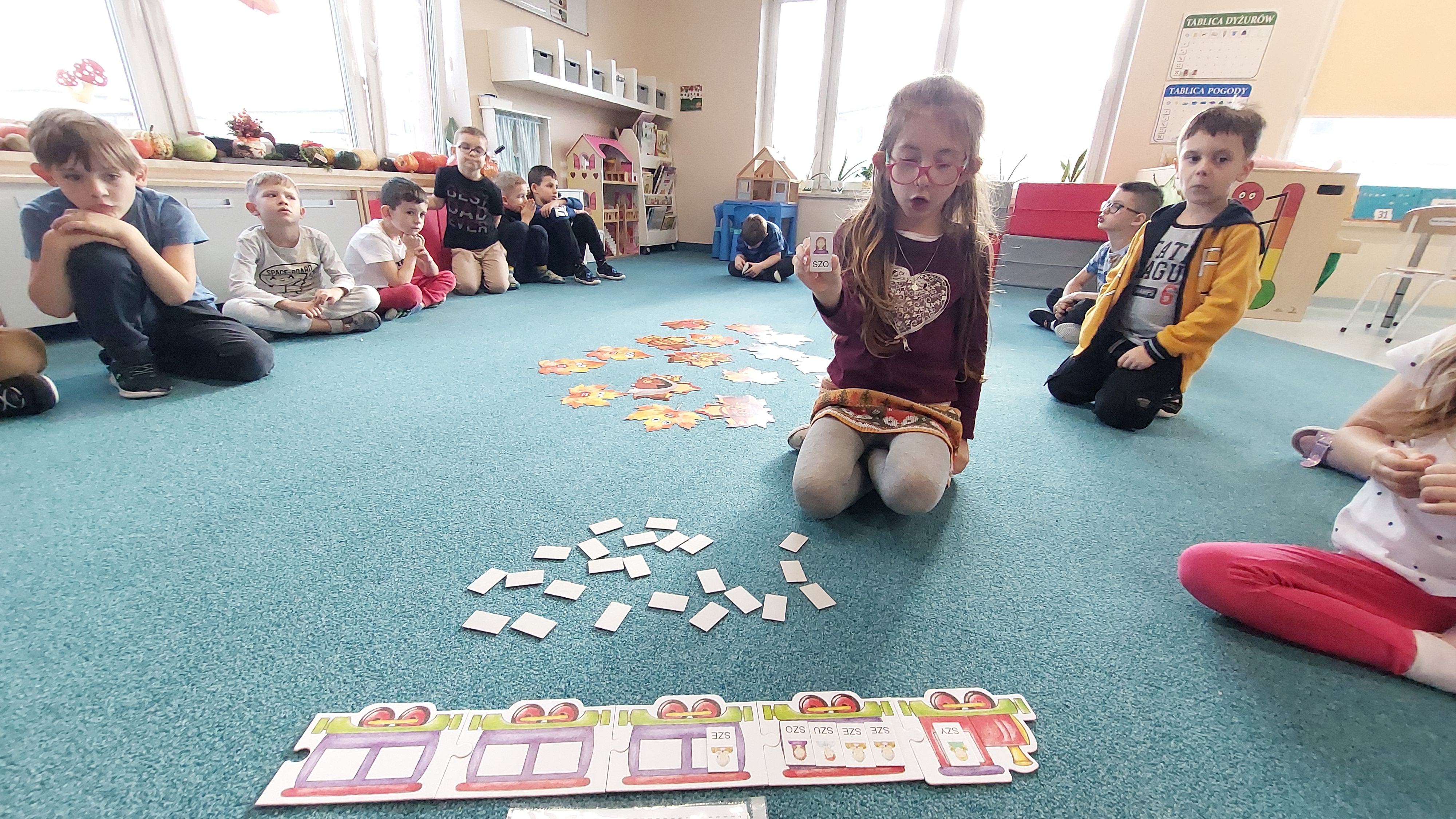 Podczas grupowych zabaw logopedycznych z Różami przypominaliśmy sobie prawidłową realizację głoski [sz] w izolacji oraz sylabach i logotomach. Podczas naszych zajęć bardzo pomocna była piosenka pt. "Szumiące liście" D. Kluski i M. Konarskiego, w której dzieci szumiały jak jesienne liście i śpiewały: sza, sze, szu, sza, szo, szy... Wykorzystaliśmy również grę dydaktyczną "Pociąg do Szumowa". Do ćwiczeń pionizujących język oraz utrwalających jego ruchomość i sprawność przydatne były minki listków oraz lusterka.