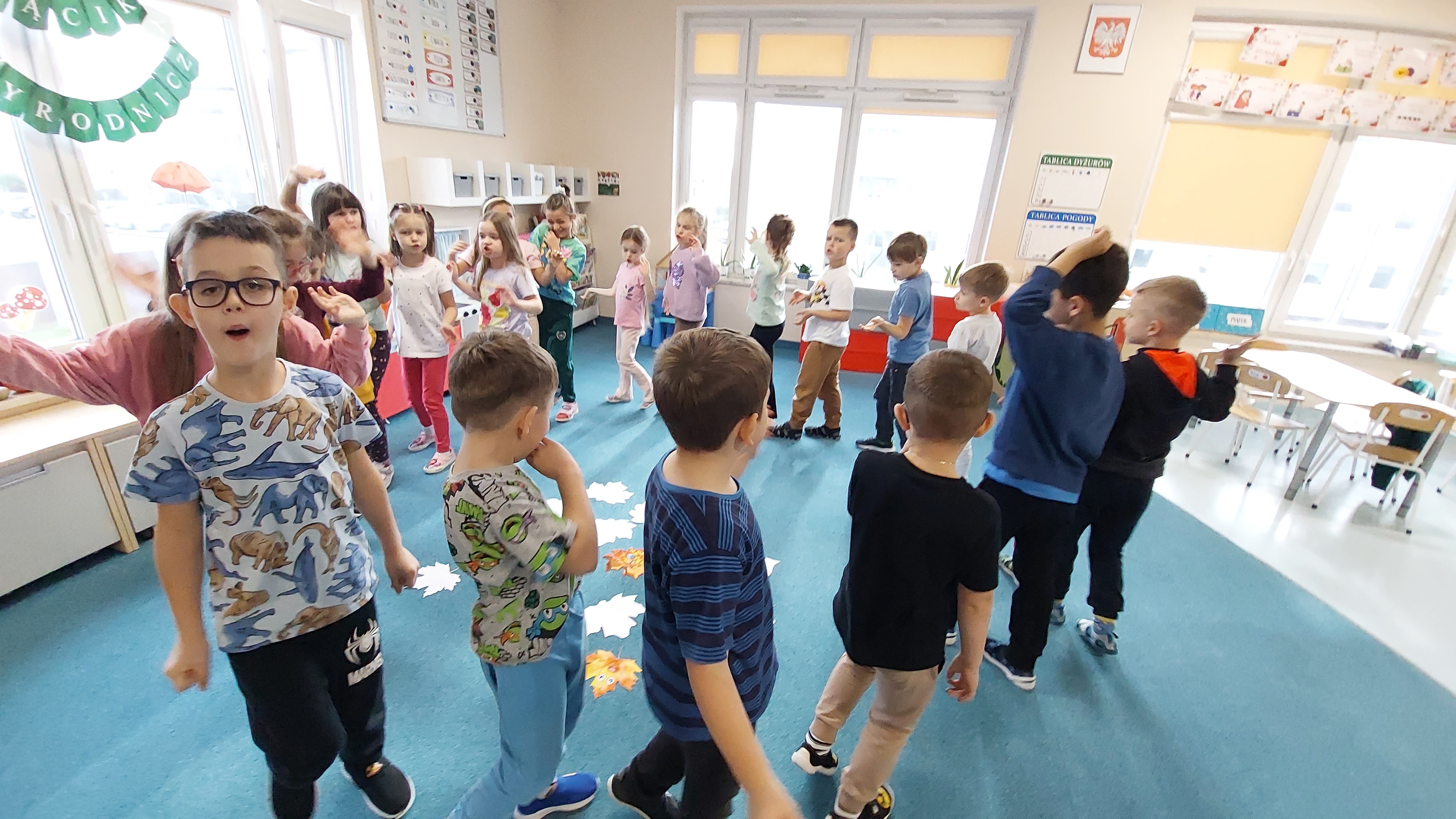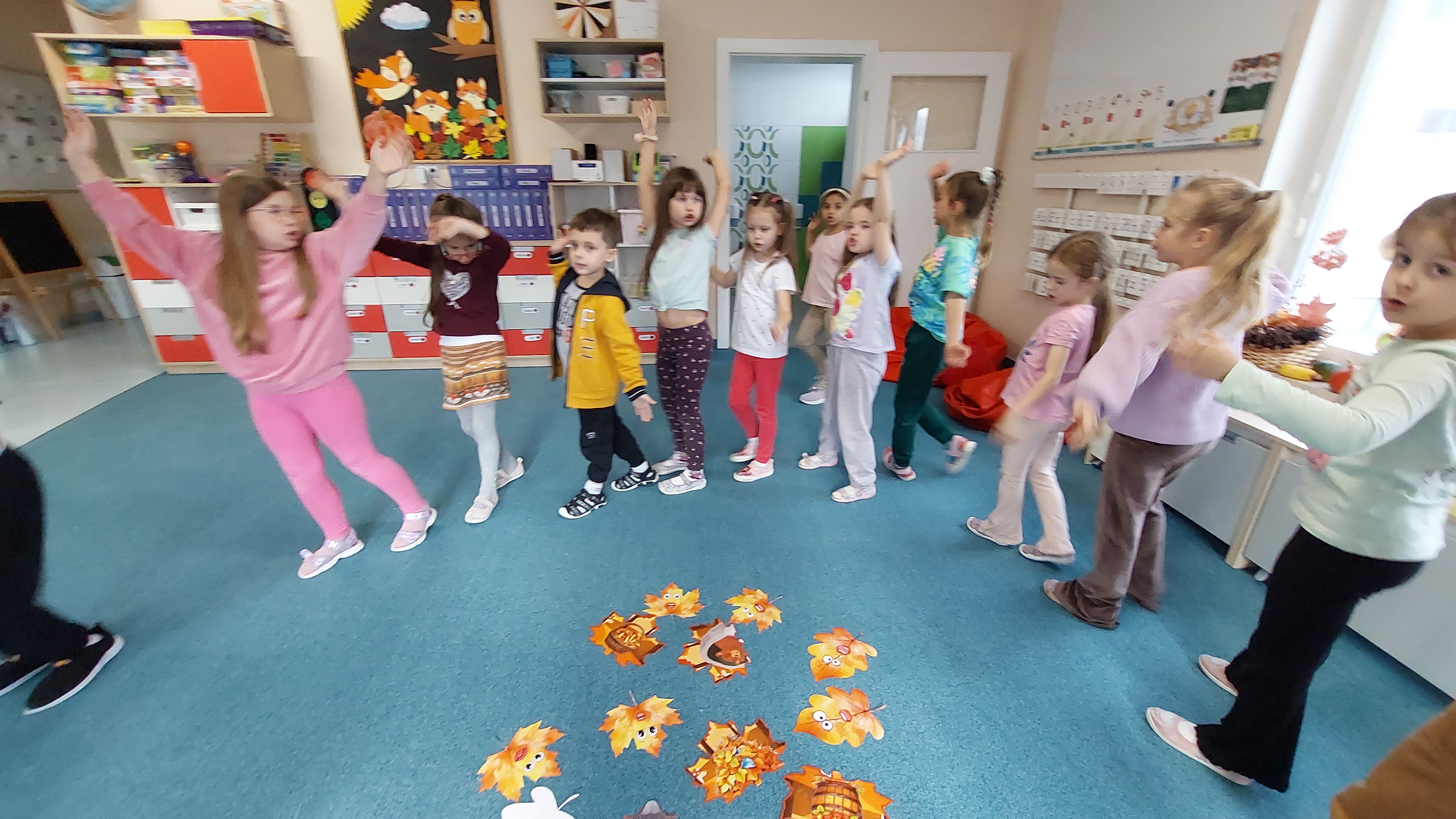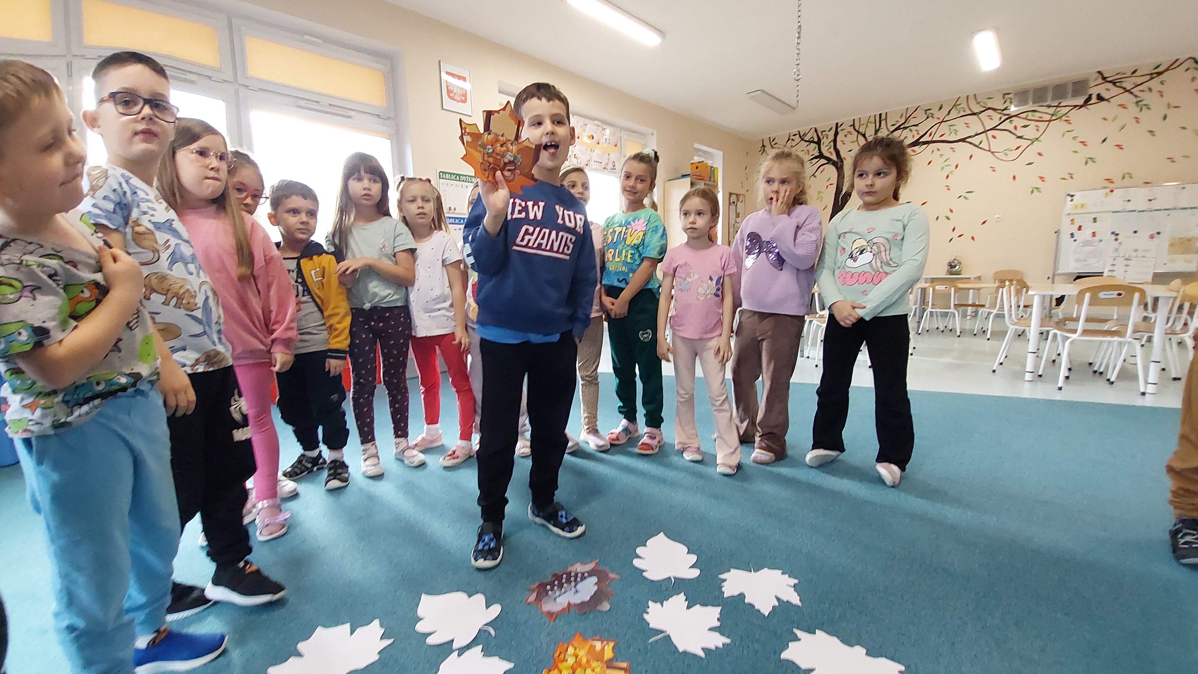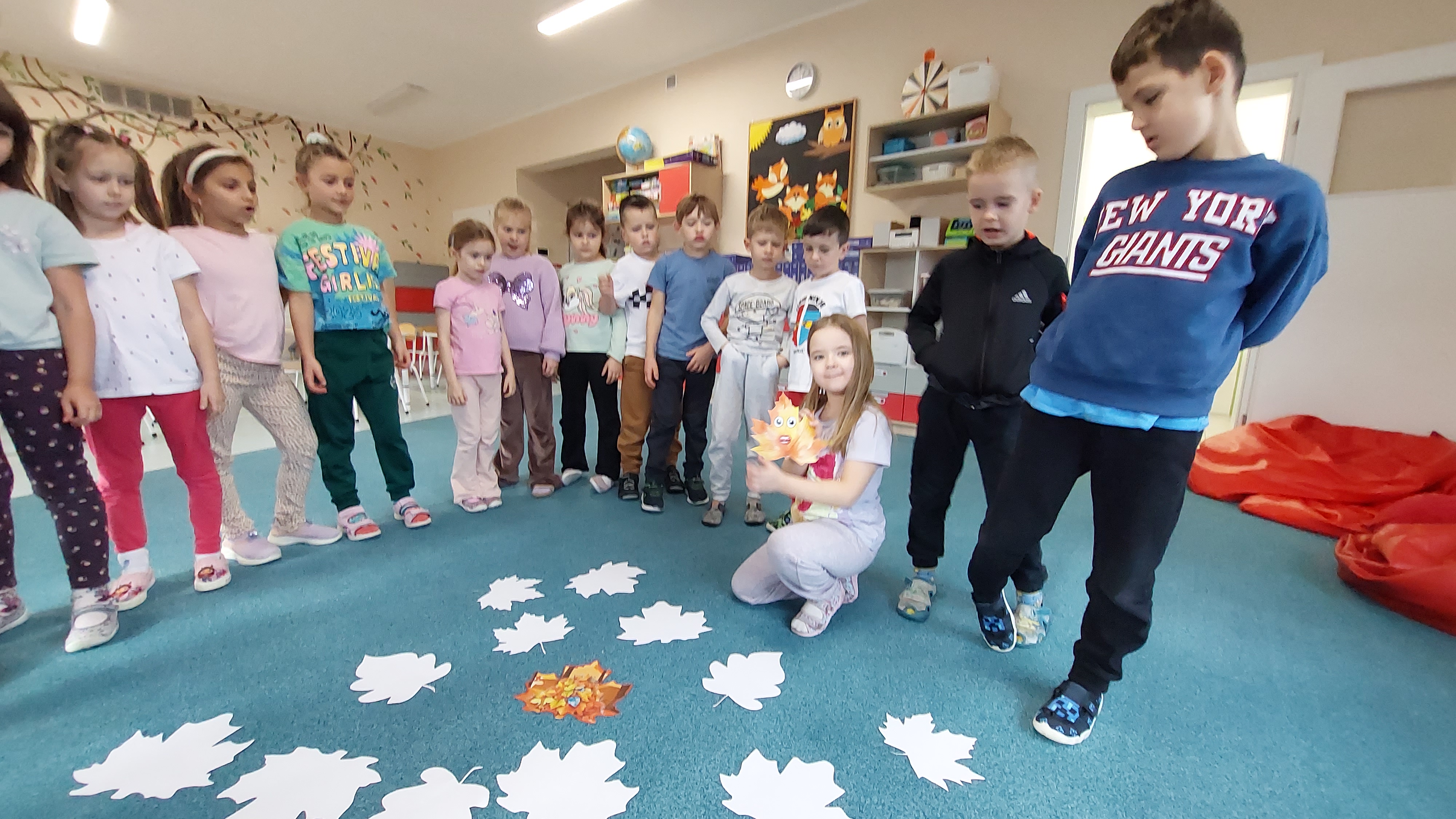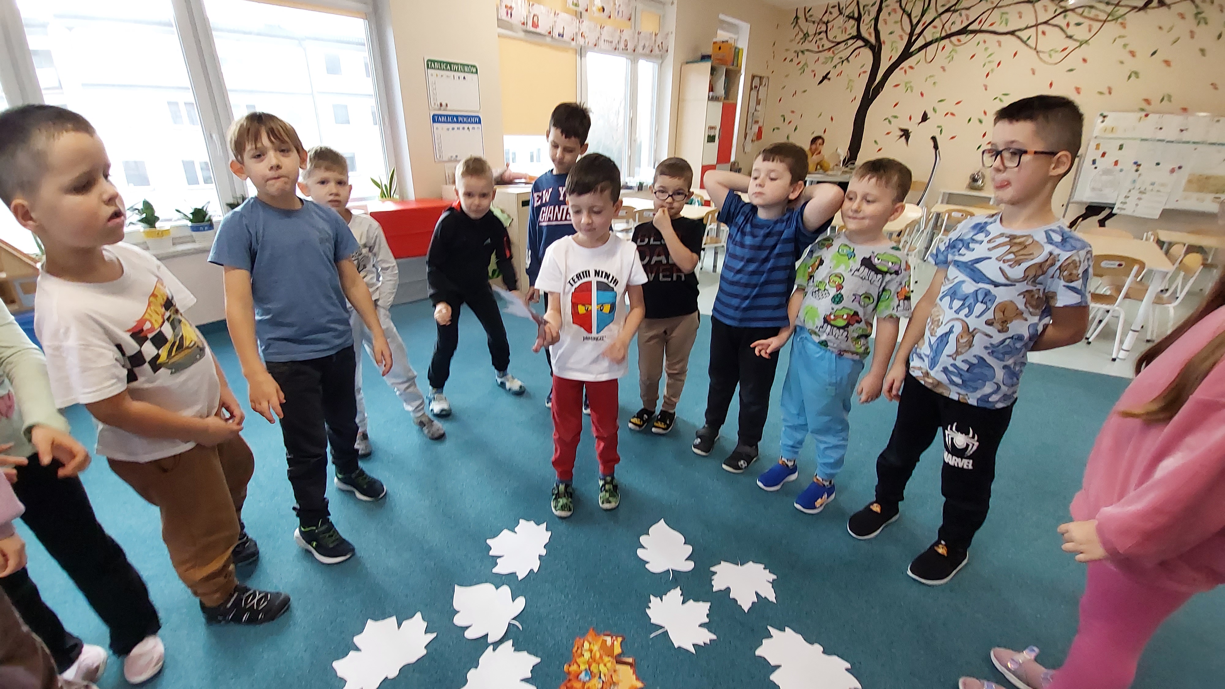Podczas grupowych zabaw logopedycznych z Różami przypominaliśmy sobie prawidłową realizację głoski [sz] w izolacji oraz sylabach i logotomach. Podczas naszych zajęć bardzo pomocna była piosenka pt. "Szumiące liście" D. Kluski i M. Konarskiego, w której dzieci szumiały jak jesienne liście i śpiewały: sza, sze, szu, sza, szo, szy... Wykorzystaliśmy również grę dydaktyczną "Pociąg do Szumowa". Do ćwiczeń pionizujących język oraz utrwalających jego ruchomość i sprawność przydatne były minki listków oraz lusterka.