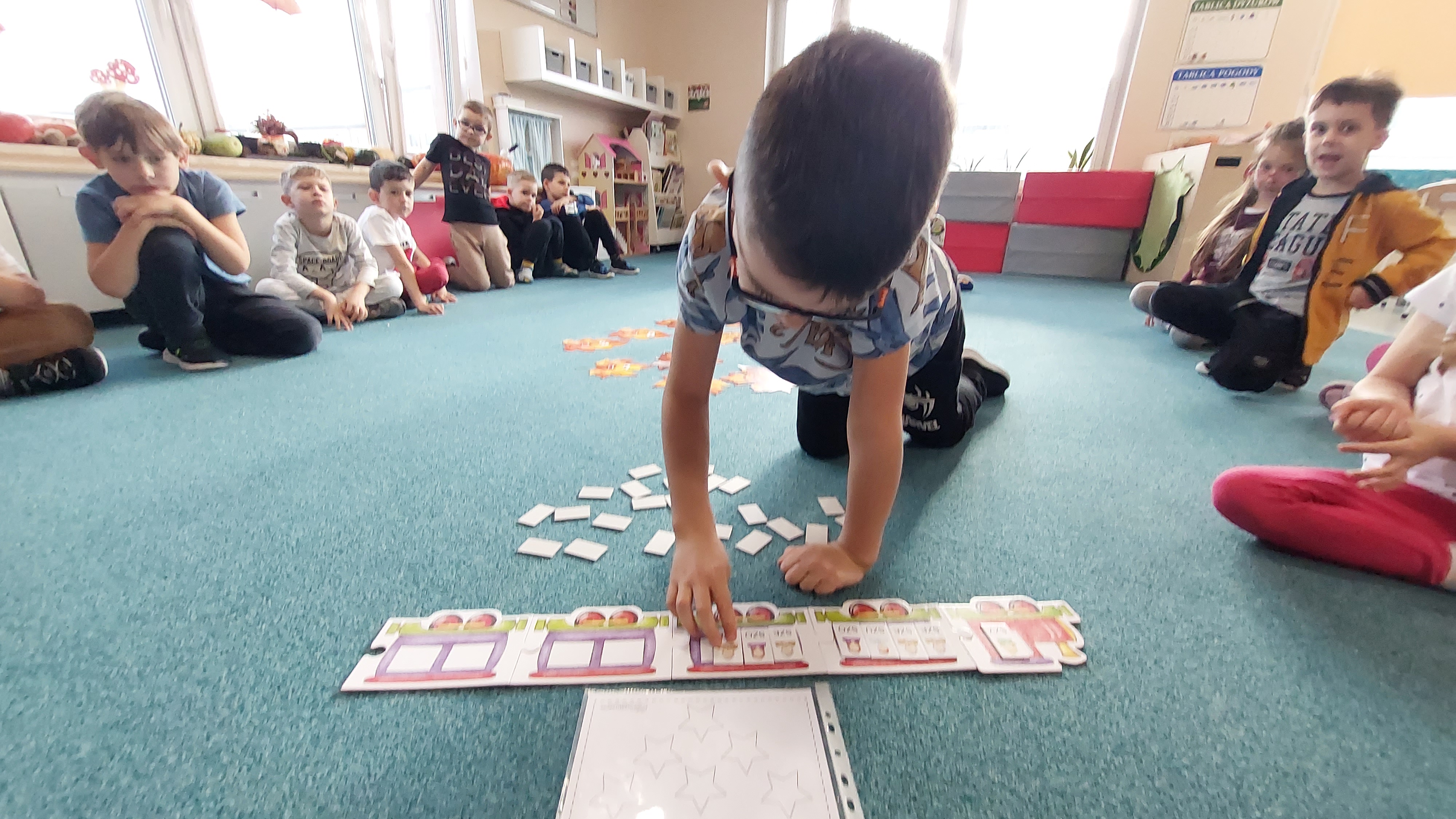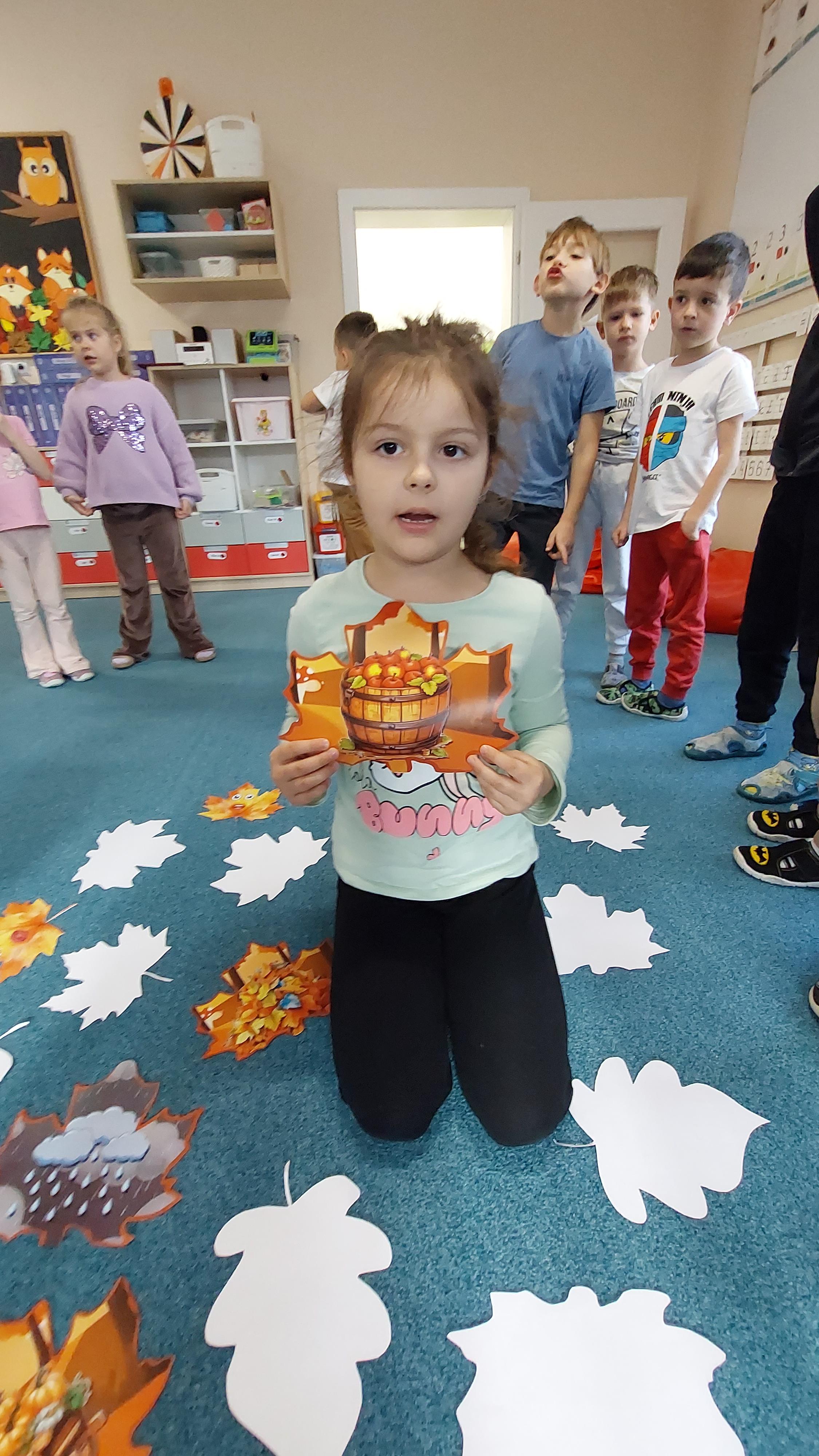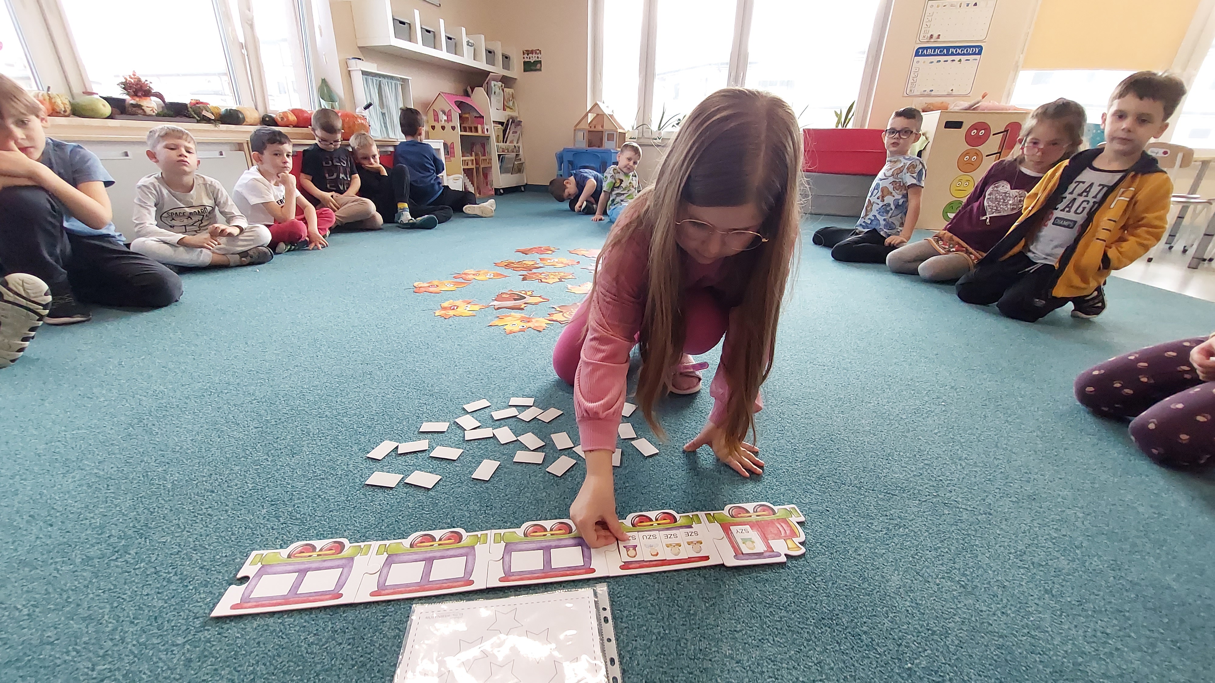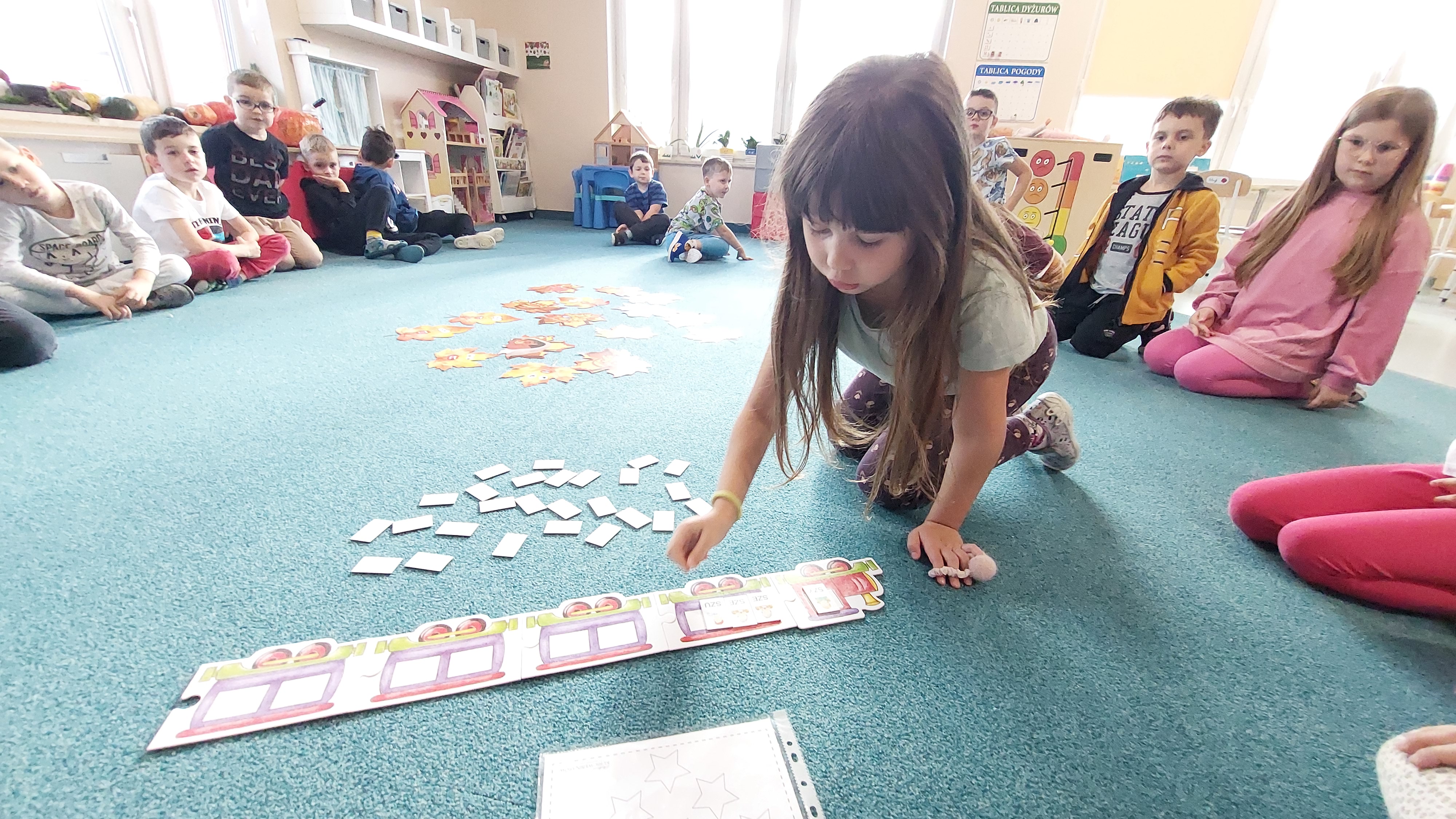Podczas grupowych zabaw logopedycznych z Różami przypominaliśmy sobie prawidłową realizację głoski [sz] w izolacji oraz sylabach i logotomach. Podczas naszych zajęć bardzo pomocna była piosenka pt. "Szumiące liście" D. Kluski i M. Konarskiego, w której dzieci szumiały jak jesienne liście i śpiewały: sza, sze, szu, sza, szo, szy... Wykorzystaliśmy również grę dydaktyczną "Pociąg do Szumowa". Do ćwiczeń pionizujących język oraz utrwalających jego ruchomość i sprawność przydatne były minki listków oraz lusterka.