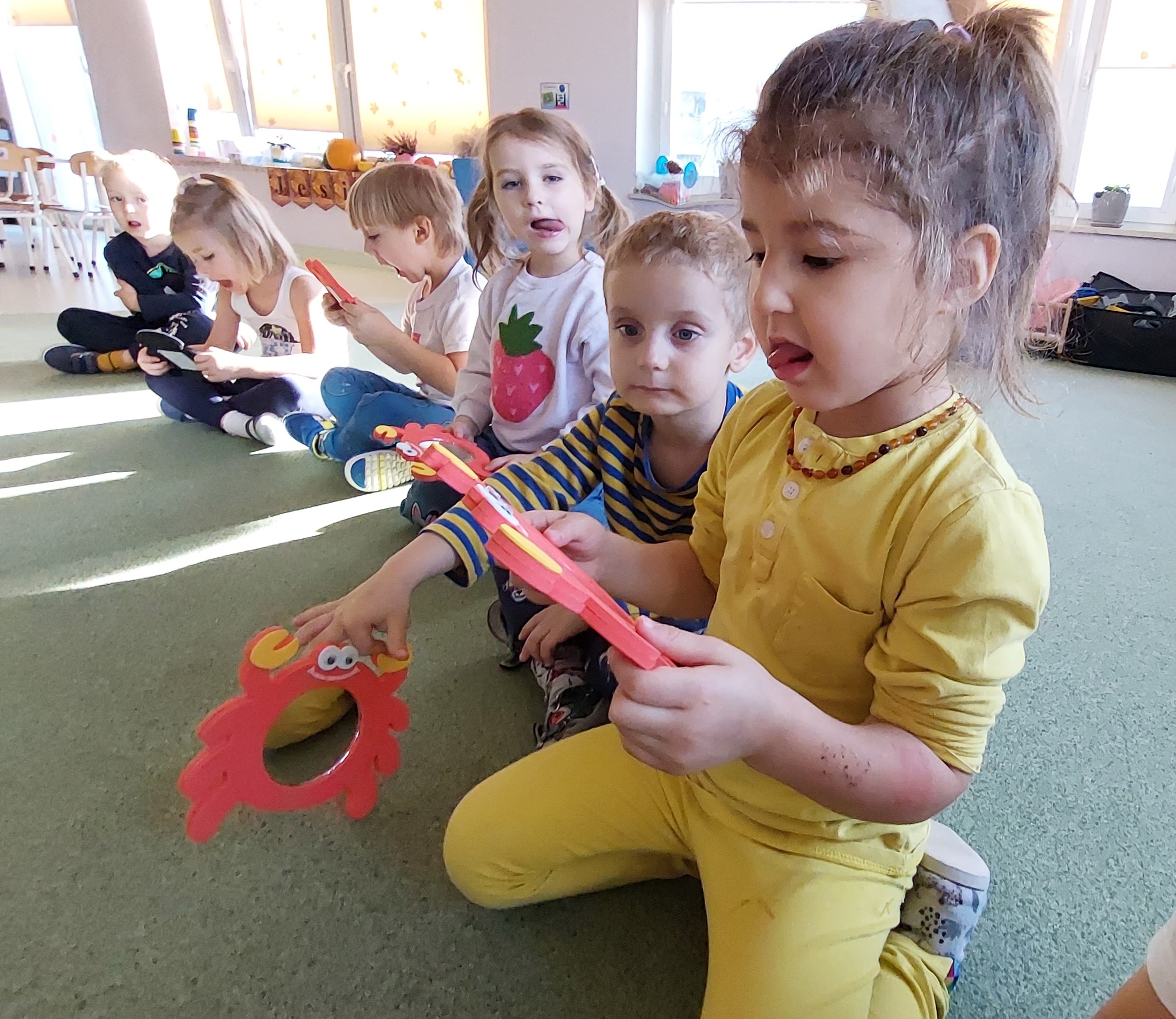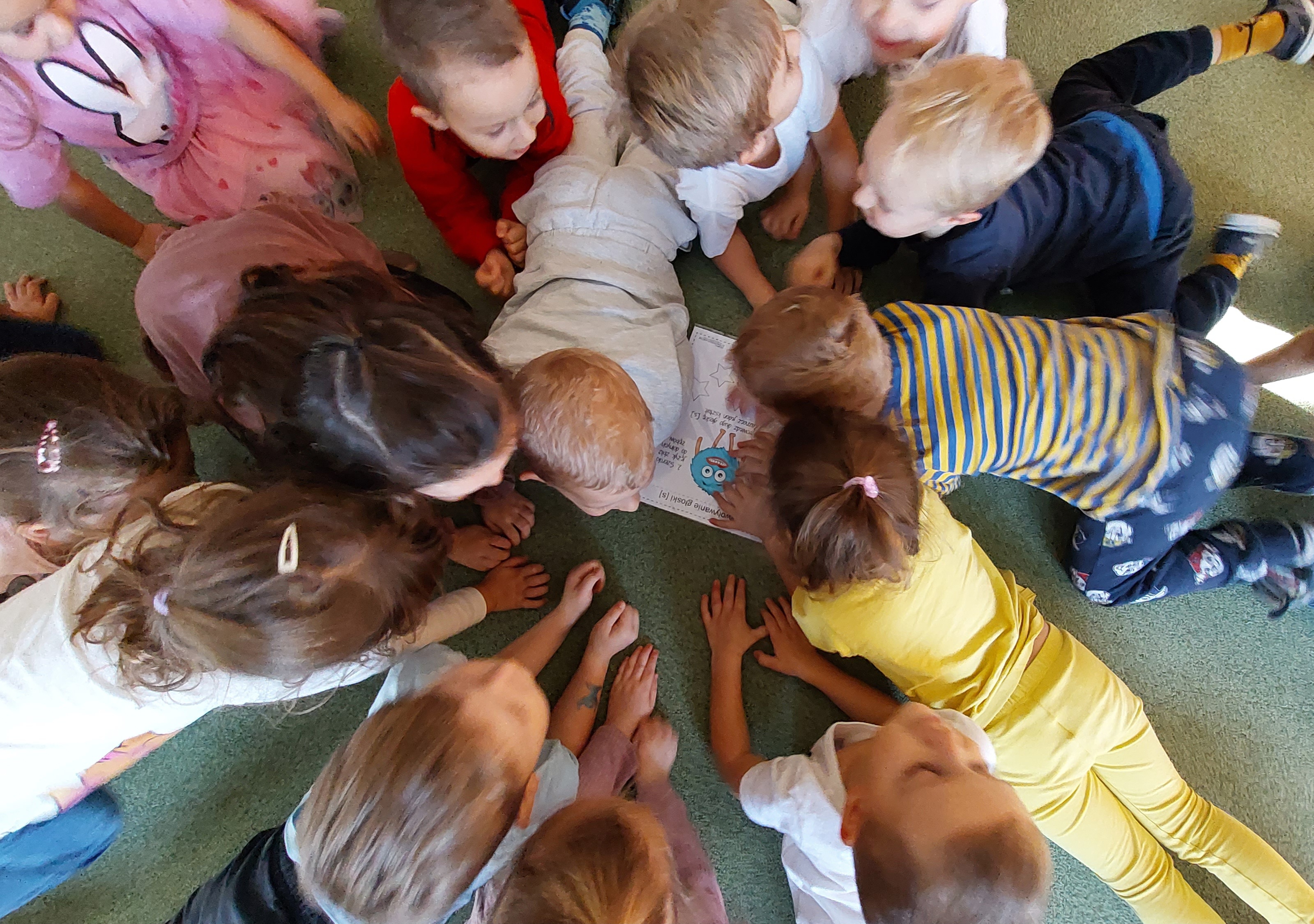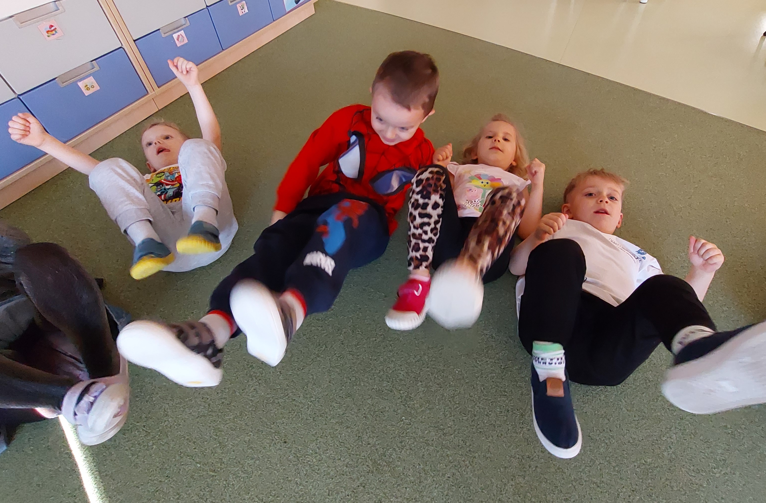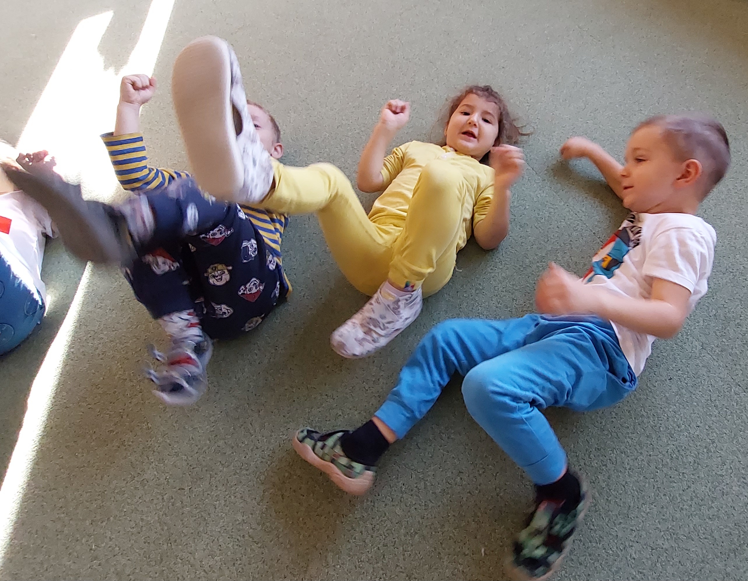 Podczas grupowych zabaw logopedycznych w Fiołkach poznawaliśmy głoskę [s] i bawiliśmy się piosenką pt. "Wycieczka rowerowa" D. Kluski i M. Konarskiego. Uruchomiliśmy motorykę dużą, ponieważ wszelkie braki w rozwoju motorycznym mogą być przyczyną zaburzeń w rozwoju mowy. Istnieje nierozerwalny związek rozwoju motorycznego z rozwojem mowy. To właśnie ruch jest elementem decydującym. Motoryka duża obejmuje wszystko to, co angażuje całe nasze ciało a motoryka mała jest od niej uzależniona, angażuje w działanie dłonie i palce, wymaga dużego skupienia uwagi i koncentracji.