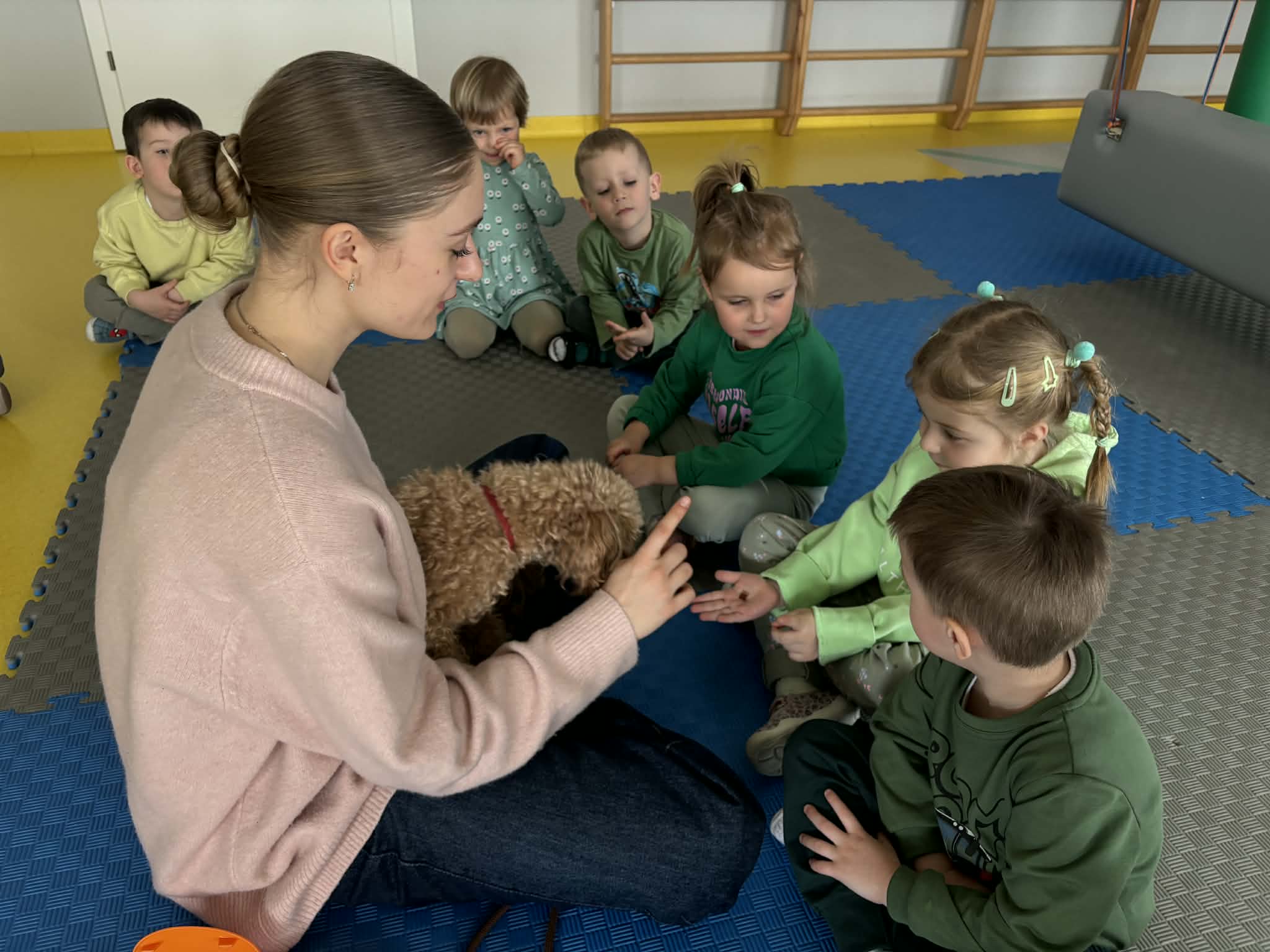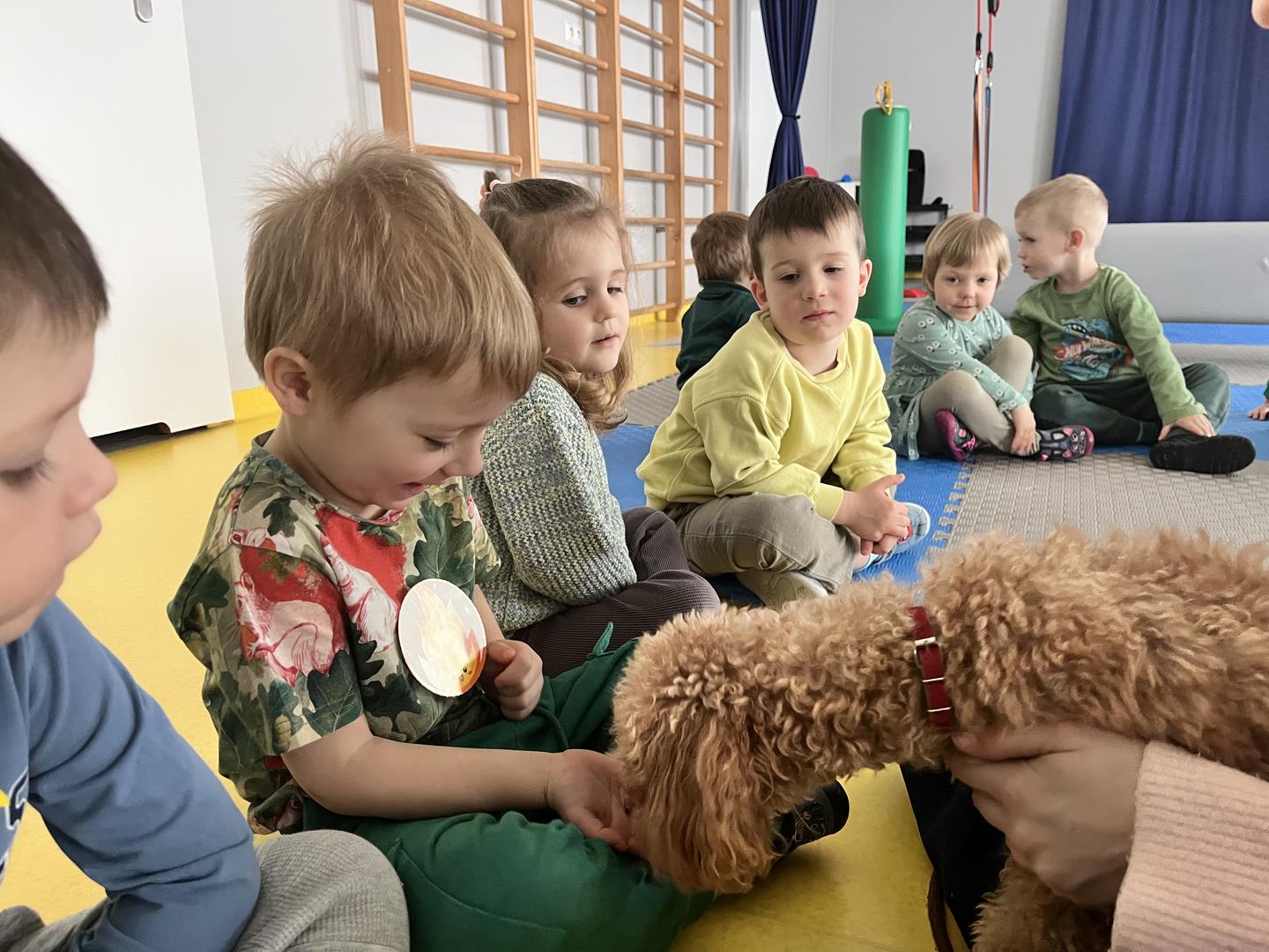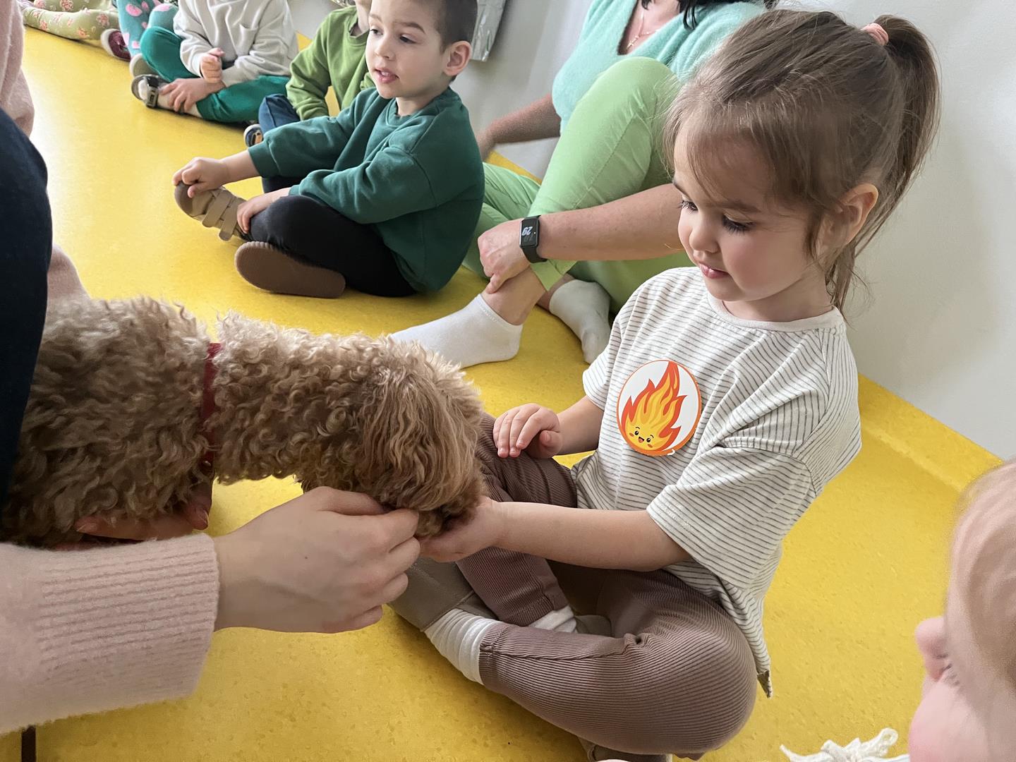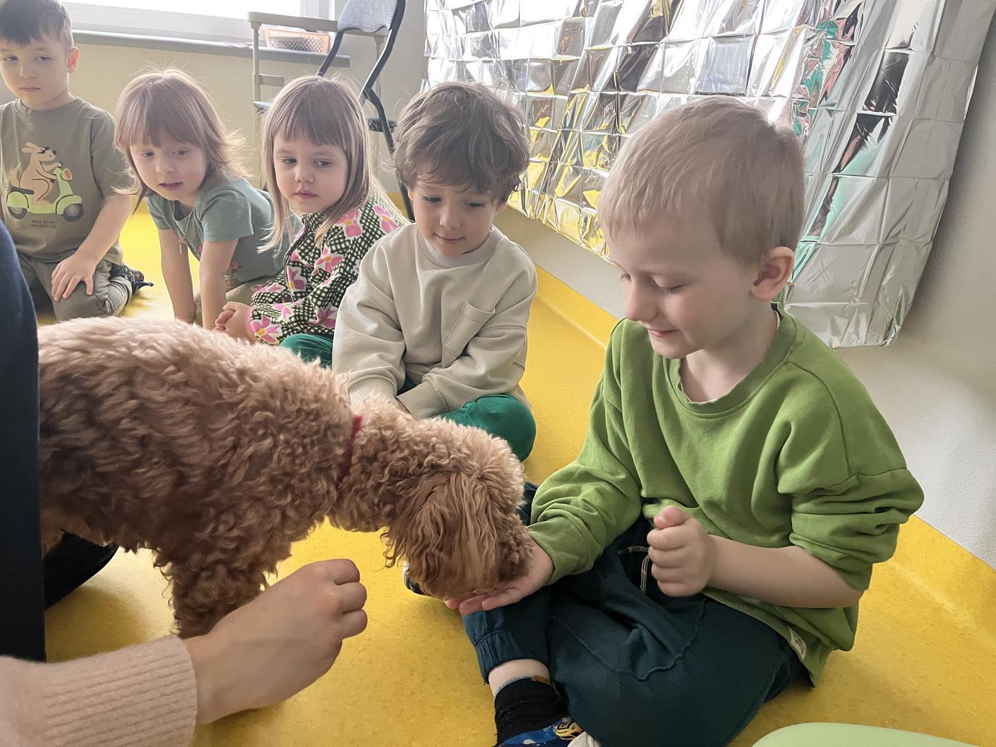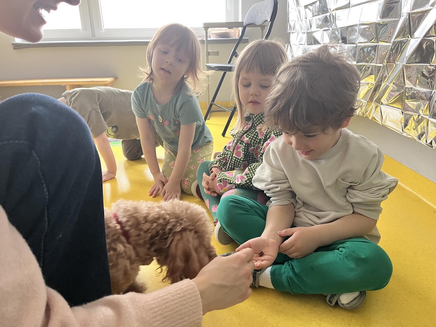 Na zakończenie tego pełnego wrażeń tygodnia odwiedzili nas wyjątkowi goście – Irysek oraz pani Ola. Zajęcia z dogoterapii były pełne uśmiechu, czułości i radości. Dzieci były zachwycone!