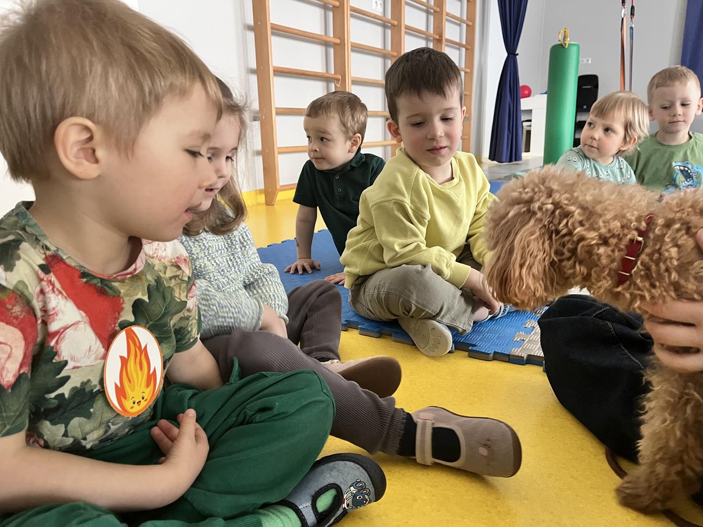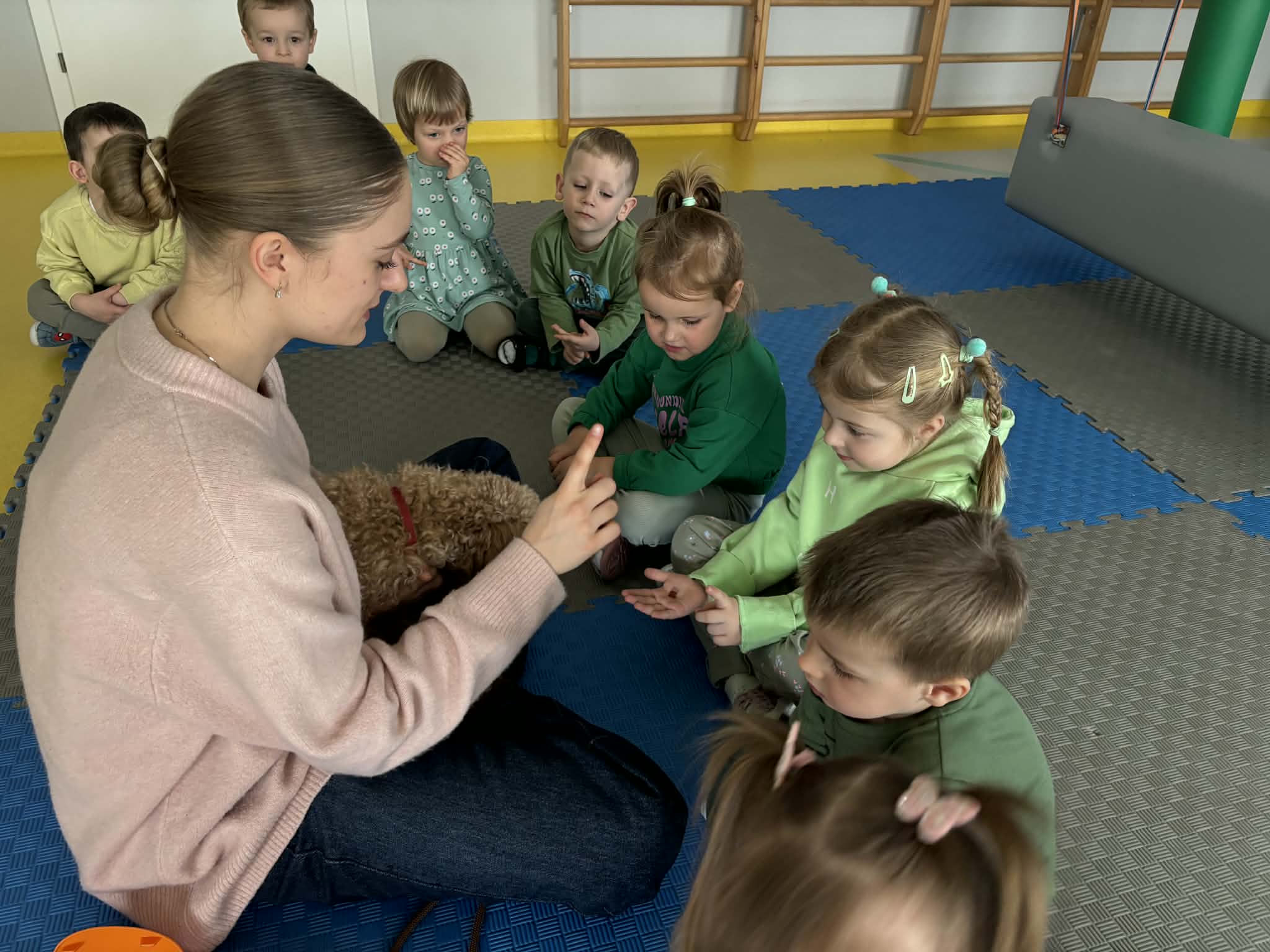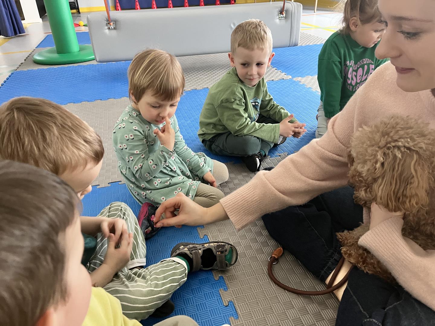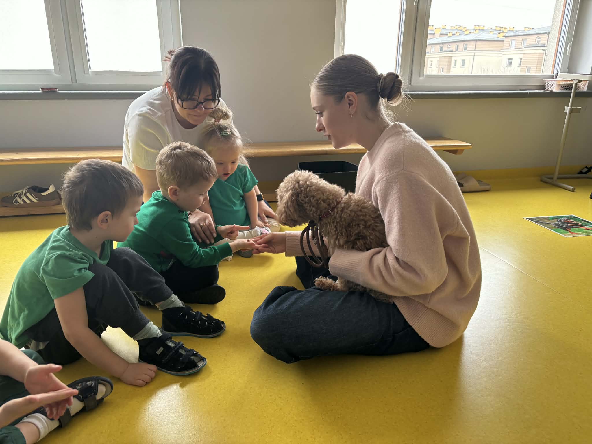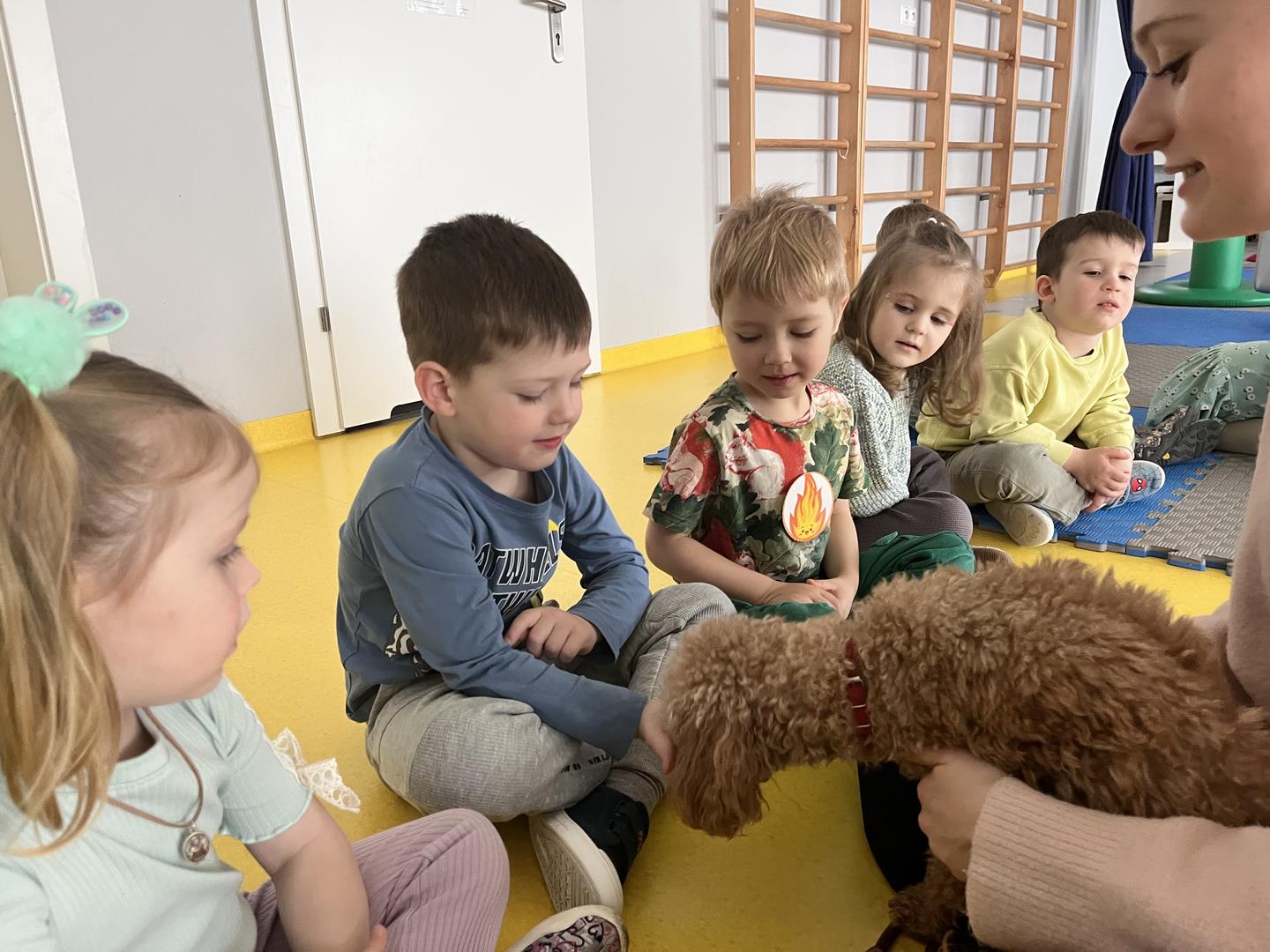 Na zakończenie tego pełnego wrażeń tygodnia odwiedzili nas wyjątkowi goście – Irysek oraz pani Ola. Zajęcia z dogoterapii były pełne uśmiechu, czułości i radości. Dzieci były zachwycone!
