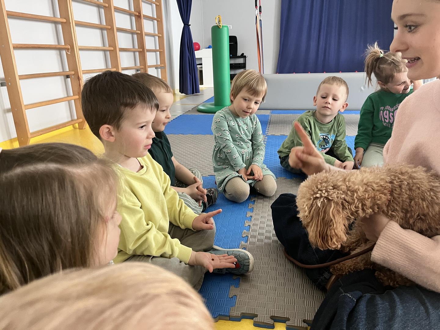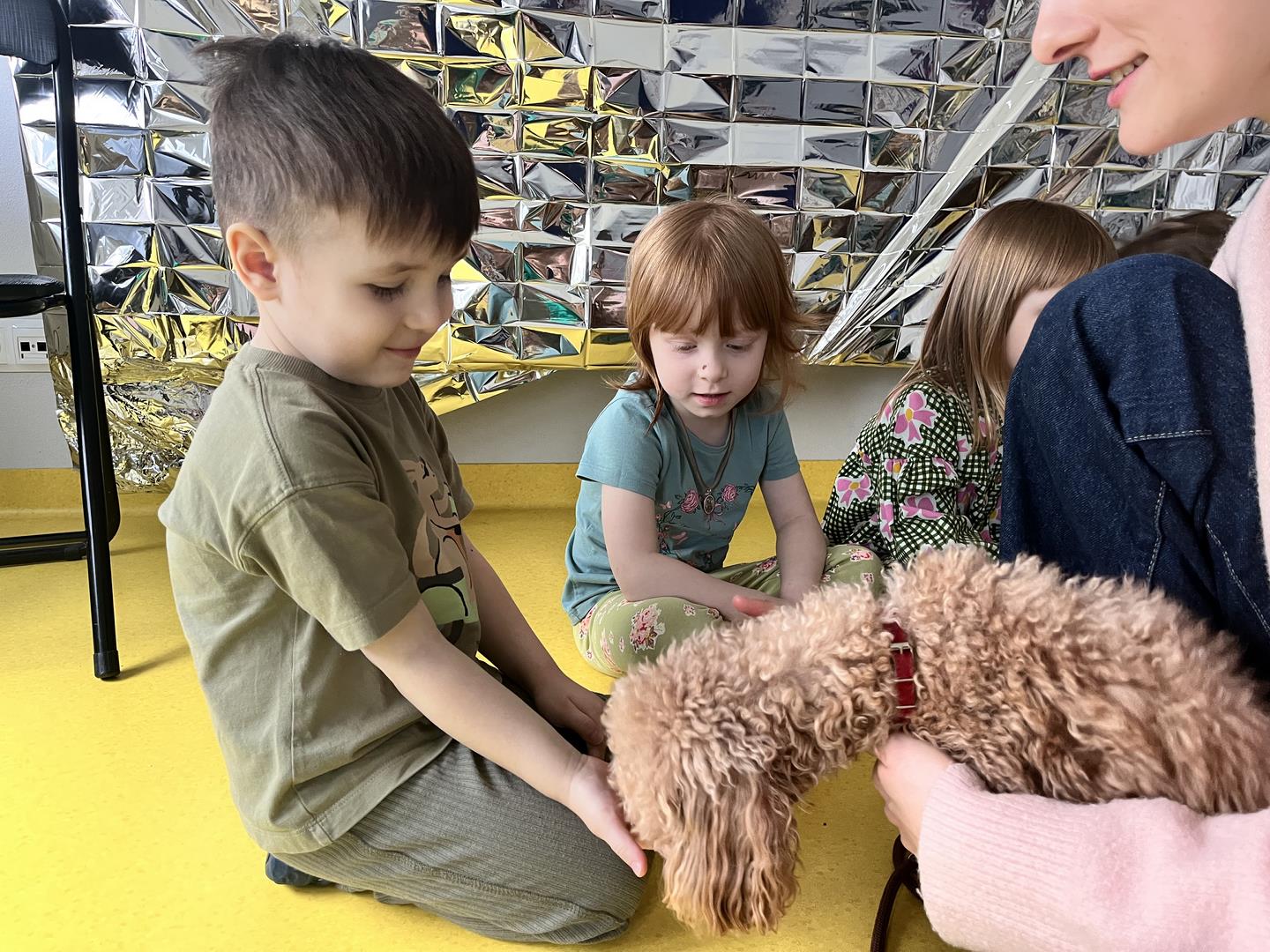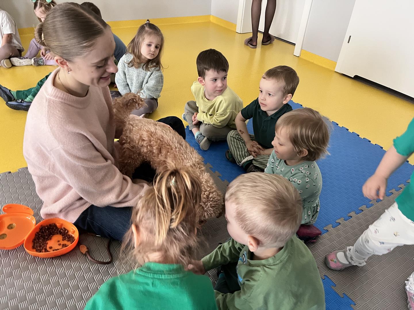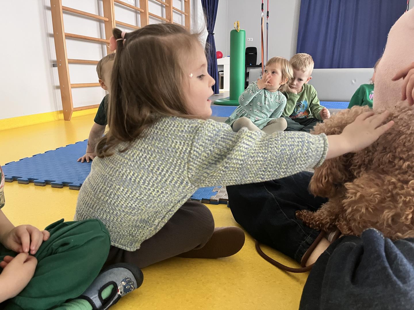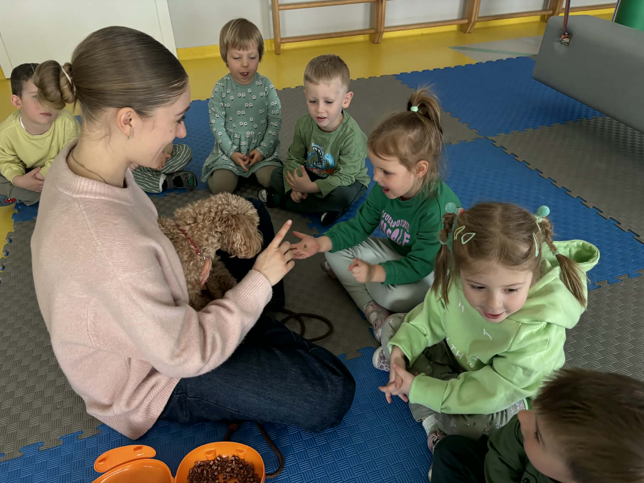 Na zakończenie tego pełnego wrażeń tygodnia odwiedzili nas wyjątkowi goście – Irysek oraz pani Ola. Zajęcia z dogoterapii były pełne uśmiechu, czułości i radości. Dzieci były zachwycone!