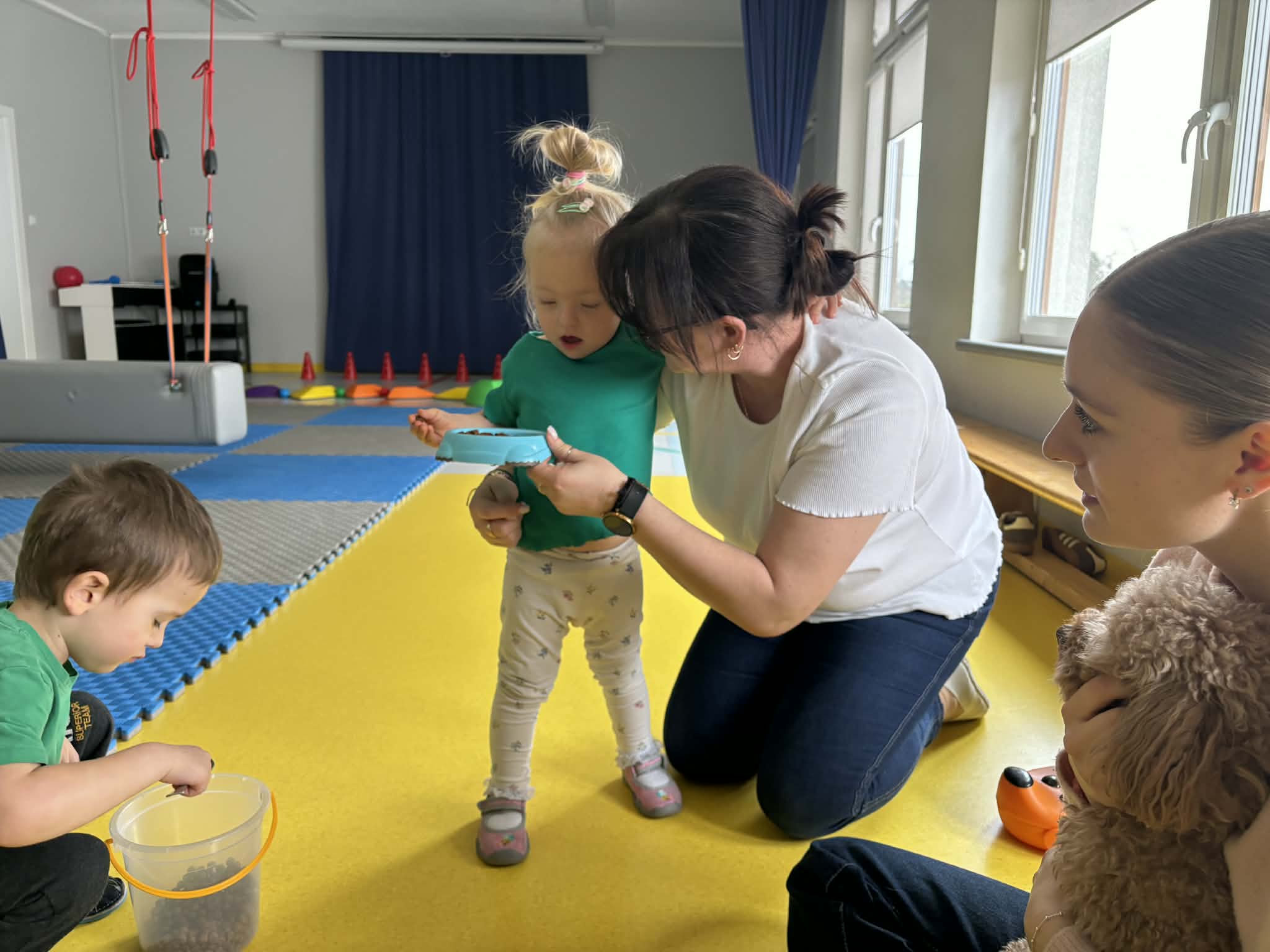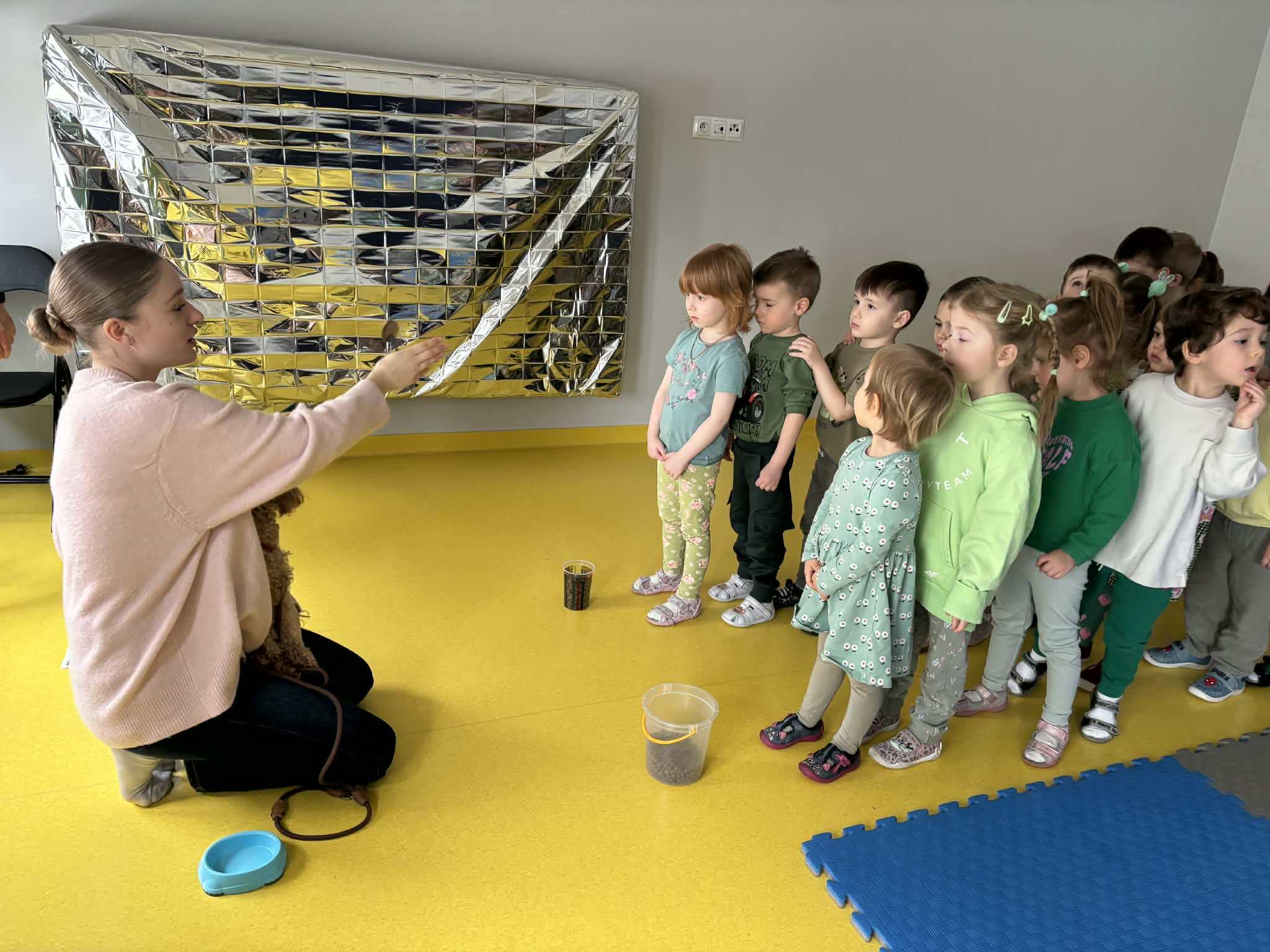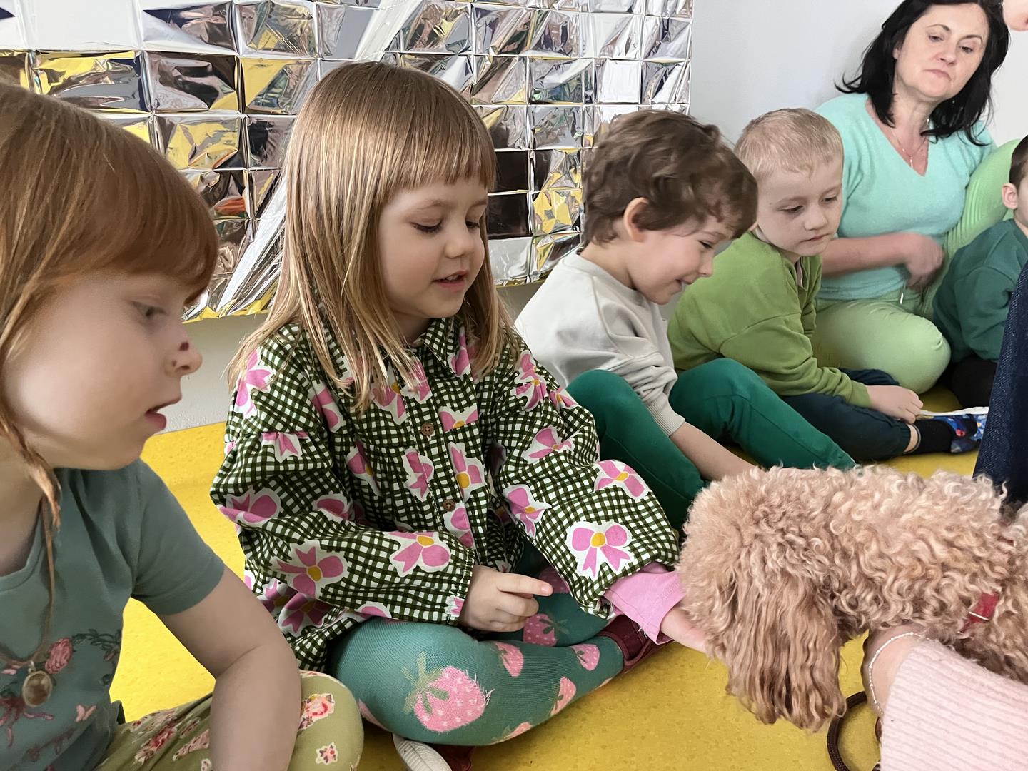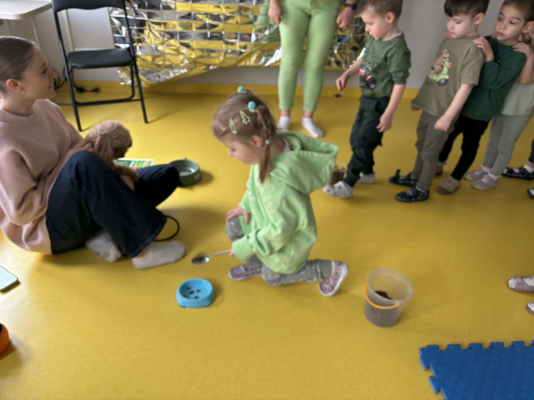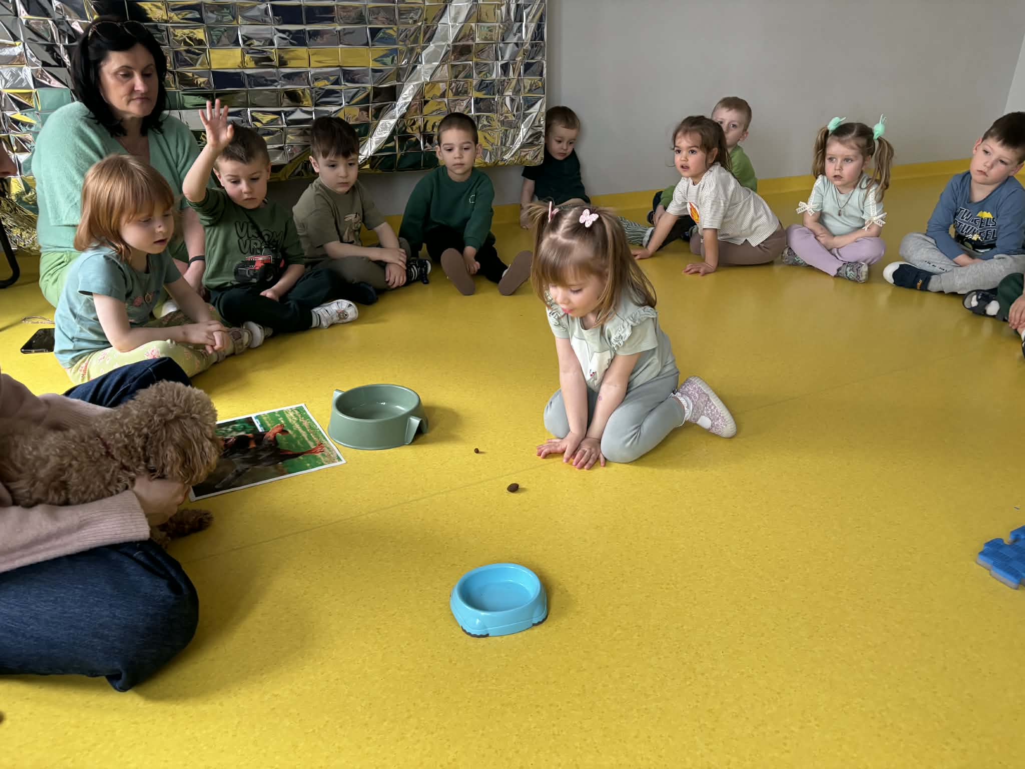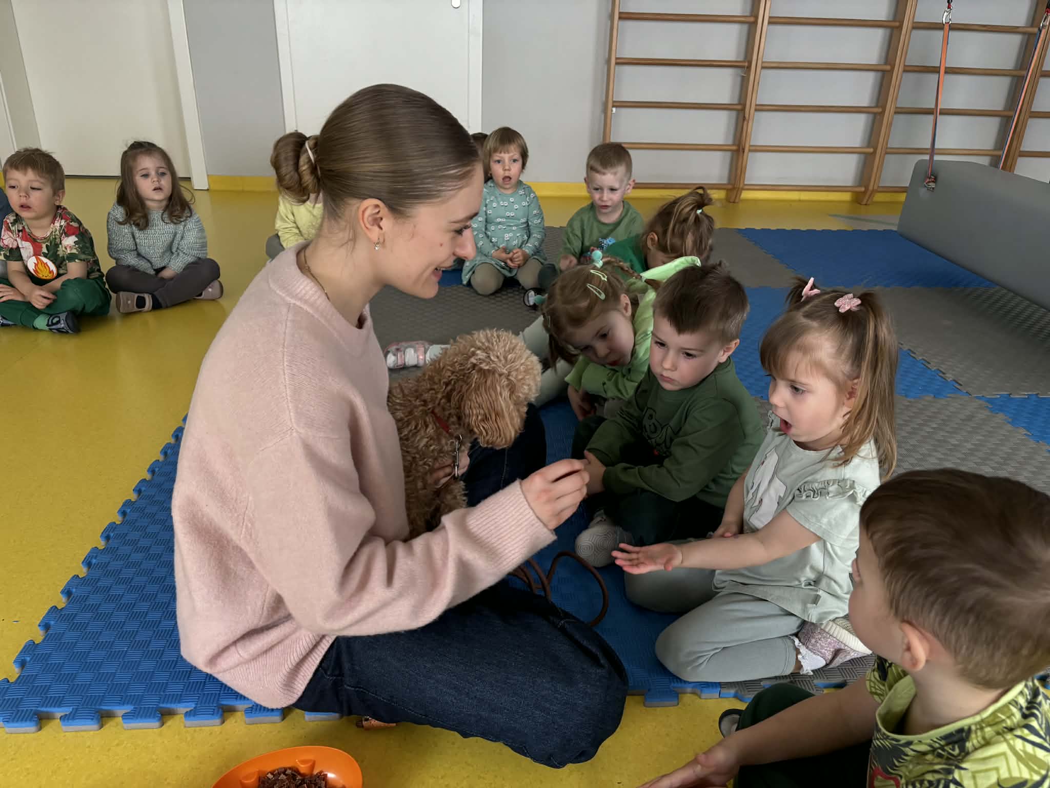Na zakończenie tego pełnego wrażeń tygodnia odwiedzili nas wyjątkowi goście – Irysek oraz pani Ola. Zajęcia z dogoterapii były pełne uśmiechu, czułości i radości. Dzieci były zachwycone!